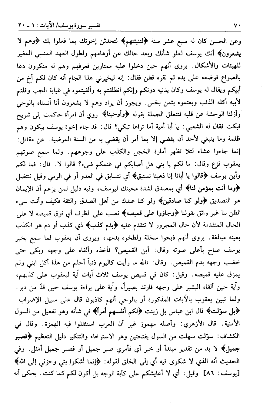 ولما تبين يعقوب بالآيات المذكورة أو بالوحي أنهم كاذبون قال على سبيل الإضراب بَلْ سَوَّلَتْ قال ابن عباس بل زينت لَكُمْ أَنْفُسُكُمْ أَمْراً في شأنه وهو تفعيل من السول الأمنية. قال الأزهري: وأصله مهموز غير أن العرب استثقلوا فيه الهمزة. وقال في الكشاف: سوّلت سهلت من السول بفتحتين وهو الاسترخاء والتنكير دليل التعظيم فَصَبْرٌ جَمِيلٌ لا بد من تقدير مبتدأ أو خبر أي فأمري صبر جميل أو فصبر جميل أمثل.