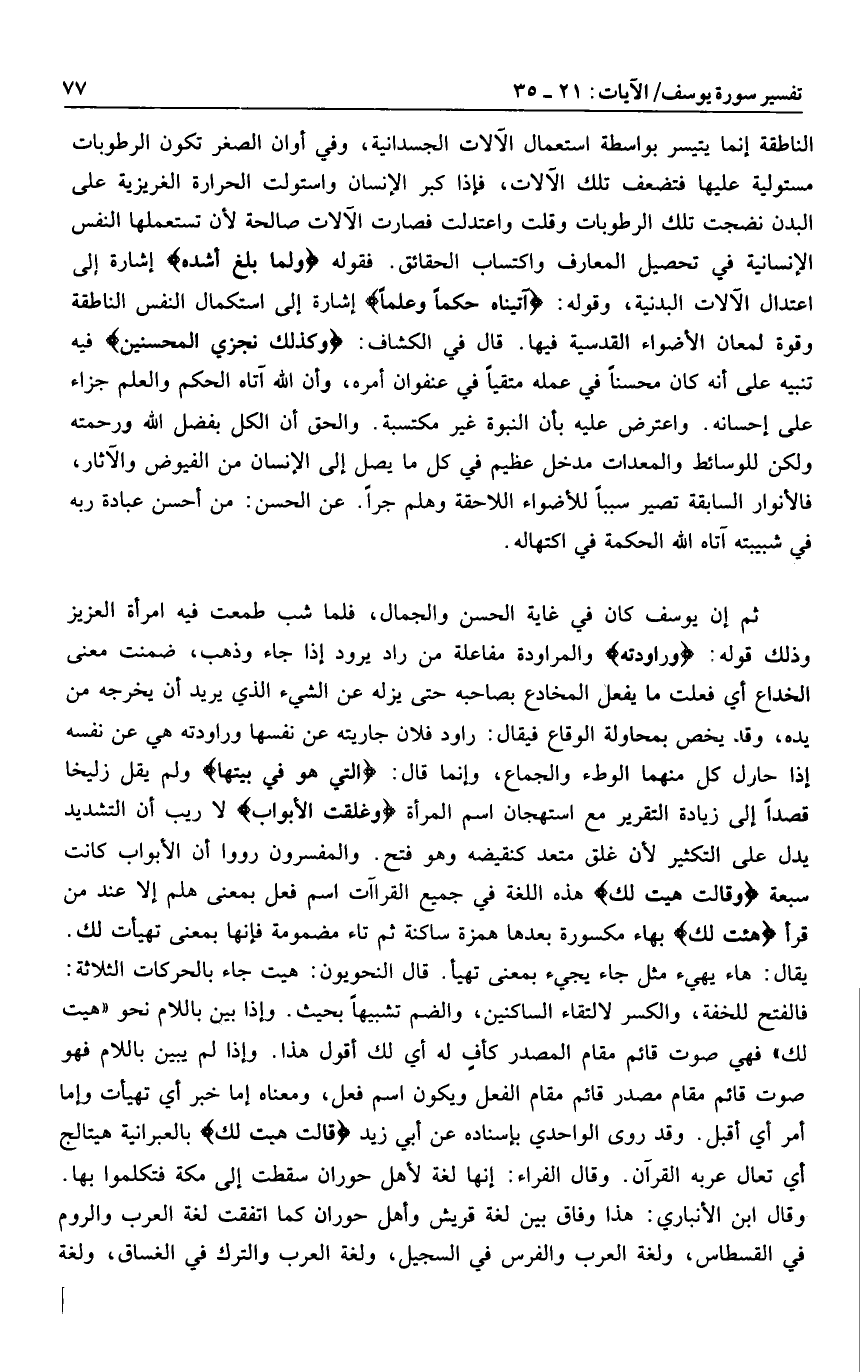 ثم إن يوسف كان في غاية الحسن والجمال، فلما شب طمعت فيه امرأة العزيز وذلك قوله: وَراوَدَتْهُ والمراودة مفاعلة من راد يرود إذا جاء وذهب، ضمنت معنى الخداع أي فعلت ما يفعل المخادع بصاحبه حتى يزله عن الشيء الذي يريد أن يخرجه من يده، وقد يخص بمحاولة الوقاع فيقال: راود فلان جاريته عن نفسها وراودته هي عن نفسه إذا حارل كل منهما الوطء والجماع، وإنما قال: الَّتِي هُوَ فِي بَيْتِها ولم يقل زليخا قصدا إلى زيادة التقرير مع استهجان اسم المرأة وَغَلَّقَتِ الْأَبْوابَ لا ريب أن التشديد يدل على التكثير لأن غلق متعد كنقيضه وهو فتح. والمفسرون رووا أن الأبواب كانت سبعة وَقالَتْ هَيْتَ لَكَ هذه اللغة في جميع القراآت اسم فعل بمعنى هلم إلا عند من قرأ هَيْتَ لَكَ بهاء مكسورة بعدها همزة ساكنة ثم تاء مضمومة فإنها بمعنى تهيأت لك.