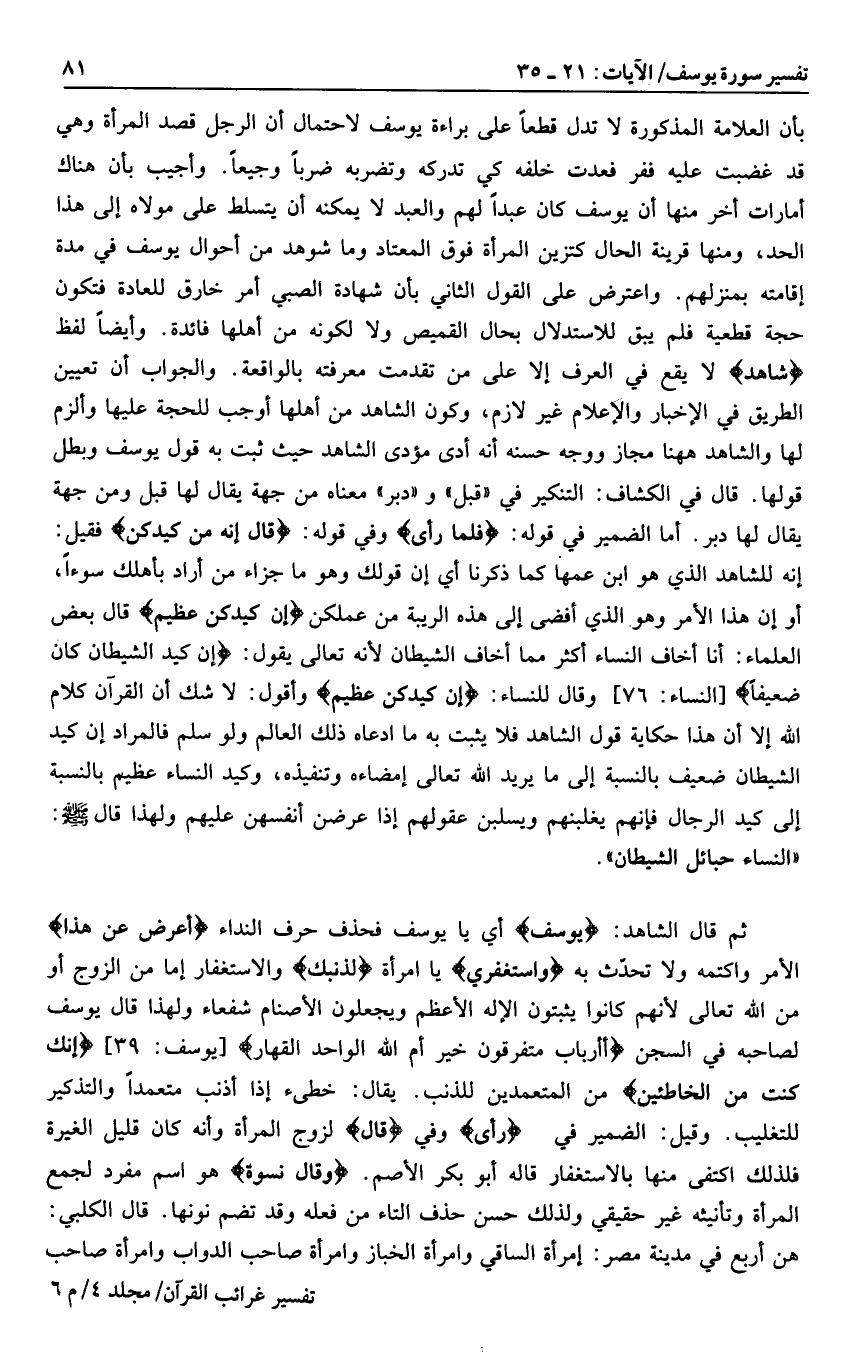 بأن العلامة المذكورة لا تدل قطعا على براءة يوسف لاحتمال أن الرجل قصد المرأة وهي قد غضبت عليه ففر فعدت خلفه كي تدركه وتضربه ضربا وجميعا. وأجيب بأن هناك أمارات أخر منها أن يوسف كان عبدا لهم والعبد لا يمكنه أن يتسلط على مولاه إلى هذا الحد، ومنها قرينة الحال كتزين المرأة فوق المعتاد وما شوهد من أحوال يوسف في مدة إقامته بمنزلهم. واعتراض على القول الثاني بأن شهادة الصبي أمر خارق للعادة فتكون حجة قطعية فلم يبق للاستدلال بحال القميص ولا لكونه من أهلها فائدة. وأيضا لفظ شاهِدٌ لا يقع في العرف إلا على من تقدمت معرفته بالواقعة. والجواب أن تعيين الطريق في الإخبار والإعلام غير لازم، وكون الشاهد من أهلها أوجب للحجة عليها وألزم لها والشاهد هاهنا مجاز ووجه حسنه أنه أدى مؤدى الشاهد حيث ثبت به قول يوسف وبطل قولها. قال في الكشاف: التنكير في «قبل» و «دبر» معناه من جهة يقال لها قبل ومن جهة يقال لها دبر. أما الضمير في قوله: فَلَمَّا رَأى وفي قوله: قالَ إِنَّهُ مِنْ كَيْدِكُنَّ فقيل: