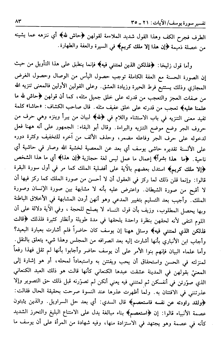 وأما قول زليخا: فَذلِكُنَّ الَّذِي لُمْتُنَّنِي فِيهِ فإنما ينطبق على هذا التأويل من حيث إن الصورة الحسنة مع العفة الكاملة توجب حصول اليأس من الوصال وحصول الغرض المجازي وذلك يستتبع فرط الحيرة وزيادة العشق. وعلى القولين الأولين فالمعنى تنزيه الله من صفات العجز والتعجب من قدرته على خلق جميل مثله، كما أن قولهن حاشَ لِلَّهِ ما عَلِمْنا عَلَيْهِ تعجب من قدرته على خلق عفيف مثله، قال صاحب الكشاف: «حاشا» كلمة تفيد معنى التنزيه في باب الاستثناء واللام في لِلَّهِ لبيان من يبرأ وينزه وهي حرف من حروف الجر وضع موضع التنزيه والبراءة. وقال أبو البقاء: الجمهور على أنه هاهنا فعل لدخوله على حرف الجر وفاعله مضمر، وحذف الألف من آخره للتخفيف وكثرة دوره على الألسنة تقديره حاشى يوسف أي بعد عن المعصية لخشية الله وصار في حاشية أي ناحية. ما هذا بَشَراً إعمال ما عمل ليس لغة حجازية إِنْ هذا أي ما هذا الشخص إِلَّا مَلَكٌ كَرِيمٌ استدل بعضهم بالآية على أفضلية الملك كما مر في أول سورة البقرة قالوا: وإنما قلن ذلك لما ركز في العقول أن لا أحسن من صورة الملك كما ركز فيها أن لا أقبح من صورة الشيطان. واعترض عليه بأنه لا مشابهة بين صورة الإنسان وصورة الملك. وأجيب بعد التسليم بتغيير المدعي وهو أنهن أردن المشابهة في الأخلاق الباطنة وبها يحصل المطلوب، وزيف بأن قول النساء لا يصلح للحجة، وفي الآية دلالة على أن اللوم انتفى لأنه لحقهن بنظرة واحدة يلحقها في مدة طويلة وأنظار كثيرة فلذلك قالَتْ فَذلِكُنَّ الَّذِي لُمْتُنَّنِي فِيهِ وسئل هاهنا إن يوسف كان حاضرا فلم أشارت بعبارة البعيد؟