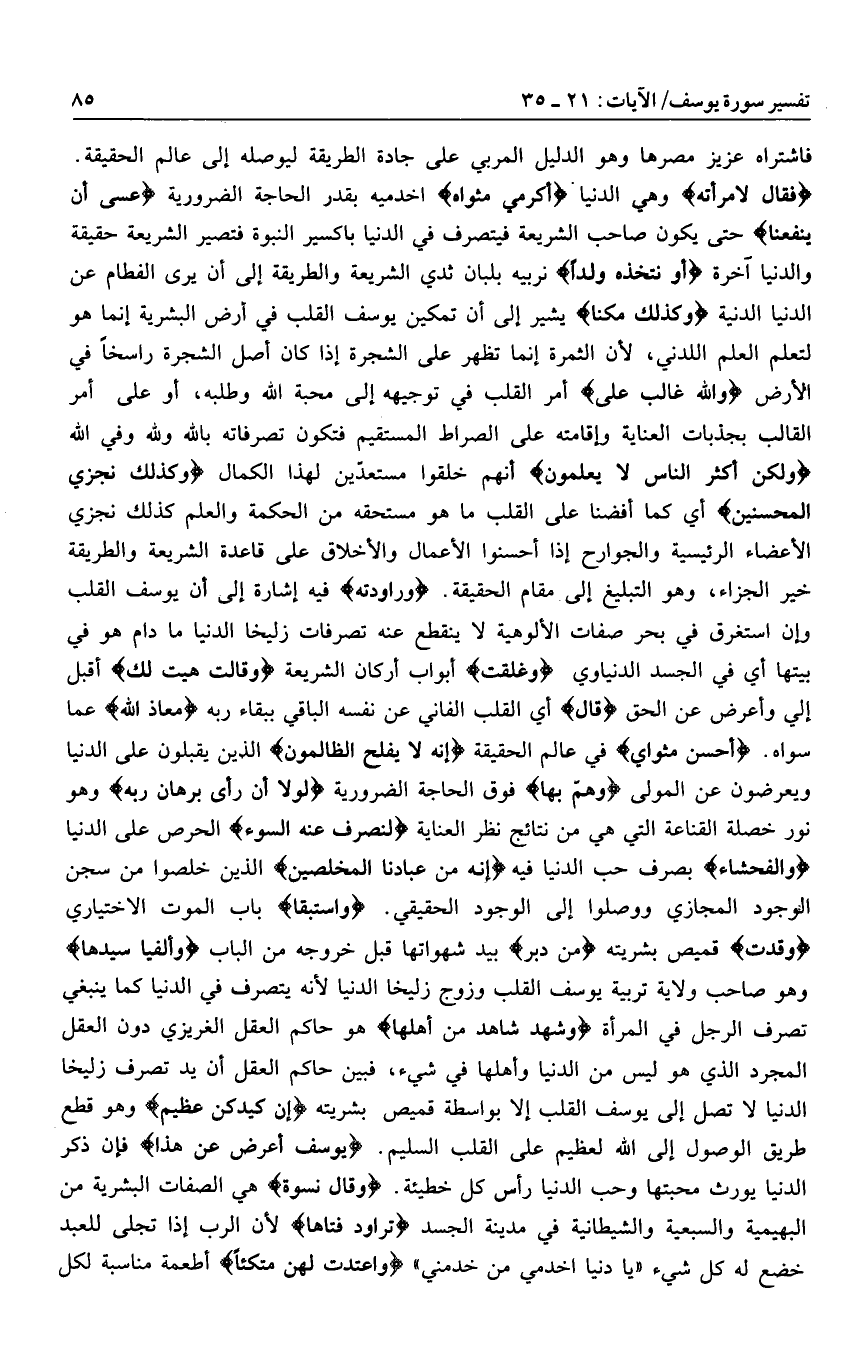 ف قالَ لِامْرَأَتِهِ وهي الدنيا أَكْرِمِي مَثْواهُ اخدميه بقدر الحاجة الضرورية عَسى أَنْ يَنْفَعَنا حتى يكون صاحب الشريعة فيتصرف في الدنيا باكسير النبوة فتصير الشريعة حقيقة والدنيا آخرة أَوْ نَتَّخِذَهُ وَلَداً نربيه بلبان ثدي الشريعة والطريقة إلى أن يرى الفطام عن الدنيا الدنية وَكَذلِكَ مَكَّنَّا يشير إلى أن تمكين يوسف القلب في أرض البشرية إنما هو لتعلم العلم اللدني، لأن الثمرة إنما تظهر على الشجرة إذا كان أصل الشجرة راسخا في الأرض وَاللَّهُ غالِبٌ عَلى أمر القلب في توجيهه إلى محبة الله وطلبه، أو على أمر القالب بجذبات العناية وإقامته على الصراط المستقيم فتكون تصرفاته بالله ولله وفي الله وَلكِنَّ أَكْثَرَ النَّاسِ لا يَعْلَمُونَ أنهم خلقوا مستعدّين لهذا الكمال وَكَذلِكَ نَجْزِي الْمُحْسِنِينَ أي كما أفضنا على القلب ما هو مستحقه من الحكمة والعلم كذلك نجزي الأعضاء الرئيسية والجوارح إذا أحسنوا الأعمال والأخلاق على قاعدة الشريعة والطريقة خير الجزاء، وهو التبليغ إلى مقام الحقيقة. وَراوَدَتْهُ فيه إشارة إلى أن يوسف القلب وإن استغرق في بحر صفات الألوهية لا ينقطع عنه تصرفات زليخا الدنيا ما دام هو في بيتها أي في الجسد الدنياوي وَغَلَّقَتِ أبواب أركان الشريعة وَقالَتْ هَيْتَ لَكَ أقبل إلي وأعرض عن الحق قالَ أي القلب الفاني عن نفسه الباقي ببقاء ربه مَعاذَ اللَّهِ عما سواه. أَحْسَنَ مَثْوايَ في عالم الحقيقة إِنَّهُ لا يُفْلِحُ الظَّالِمُونَ الذين يقبلون على الدنيا ويعرضون عن المولى وَهَمَّ بِها فوق الحاجة الضرورية لَوْلا أَنْ رَأى بُرْهانَ رَبِّهِ وهو نور خصلة القناعة التي هي من نتائج نظر العناية لِنَصْرِفَ عَنْهُ السُّوءَ الحرص على الدنيا وَالْفَحْشاءَ بصرف حب الدنيا فيه إِنَّهُ مِنْ عِبادِنَا الْمُخْلَصِينَ الذين خلصوا من سجن الوجود المجازي ووصلوا إلى الوجود الحقيقي. وَاسْتَبَقَا باب الموت الاختياري وَقَدَّتْ قميص بشريته مِنْ دُبُرٍ بيد شهواتها قبل خروجه من الباب وَأَلْفَيا سَيِّدَها وهو صاحب ولاية تربية يوسف القلب وزوج زليخا الدنيا لأنه يتصرف في الدنيا كما ينبغي تصرف الرجل في المرأة وَشَهِدَ شاهِدٌ مِنْ أَهْلِها هو حاكم العقل الغريزي دون العقل المجرد الذي هو ليس من الدنيا وأهلها في شيء، فبين حاكم العقل أن يد تصرف زليخا الدنيا لا تصل إلى يوسف القلب إلا بواسطة قميص بشريته إِنَّ كَيْدَكُنَّ عَظِيمٌ وهو قطع طريق الوصول إلى الله لعظيم على القلب السليم. يُوسُفُ أَعْرِضْ عَنْ هذا فإن ذكر الدنيا يورث محبتها وحب الدنيا رأس كل خطيئة. وَقالَ نِسْوَةٌ هي الصفات البشرية من البهيمية والسبعية والشيطانية في مدينة الجسد تُراوِدُ فَتاها لأن الرب إذا تجلى للعبد خضع له كل شيء