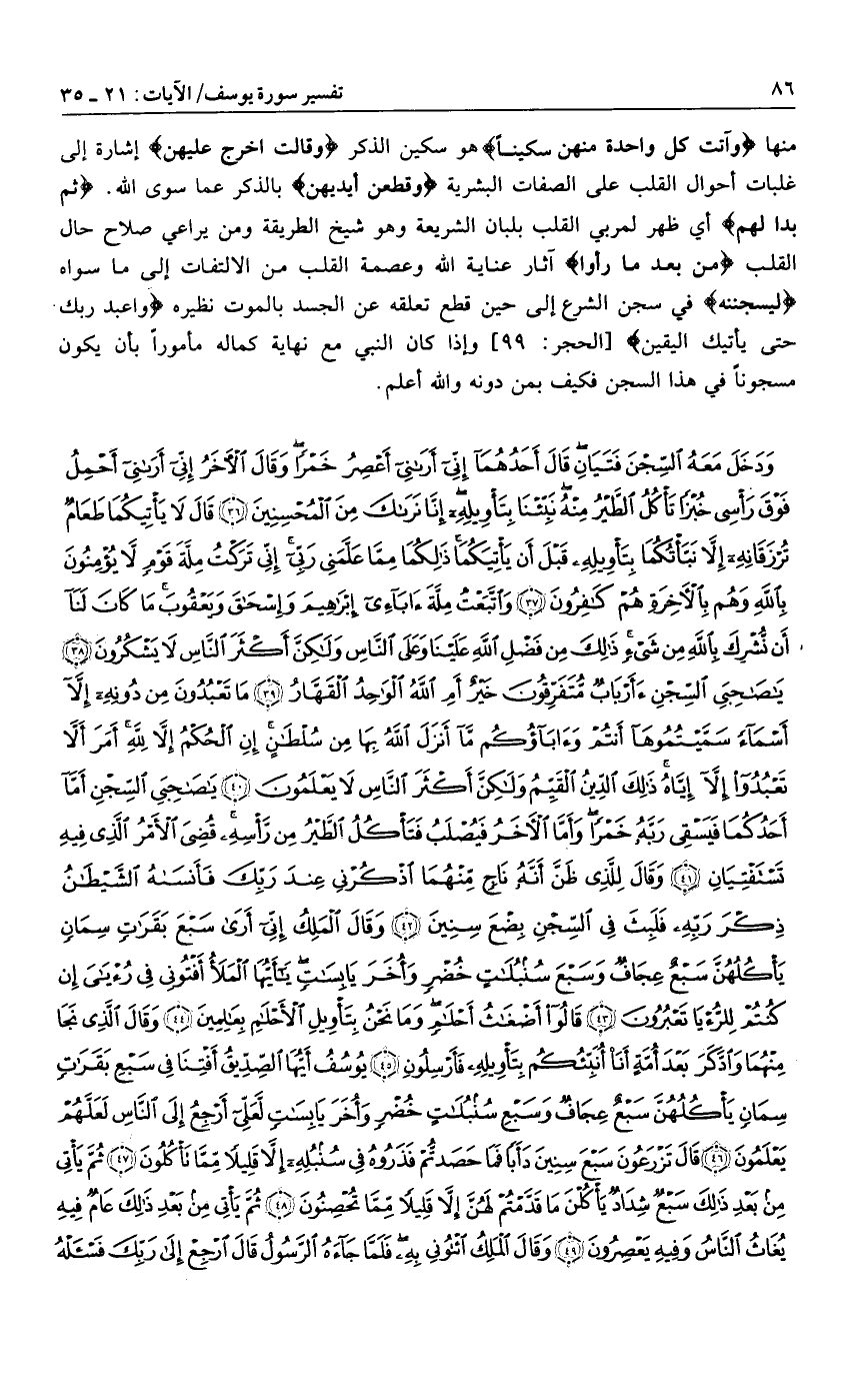 وَدَخَلَ مَعَهُ السِّجْنَ فَتَيانِ قالَ أَحَدُهُما إِنِّي أَرانِي أَعْصِرُ خَمْراً وَقالَ الْآخَرُ إِنِّي أَرانِي أَحْمِلُ فَوْقَ رَأْسِي خُبْزاً تَأْكُلُ الطَّيْرُ مِنْهُ نَبِّئْنا بِتَأْوِيلِهِ إِنَّا نَراكَ مِنَ الْمُحْسِنِينَ (36) قالَ لا يَأْتِيكُما طَعامٌ تُرْزَقانِهِ إِلاَّ نَبَّأْتُكُما بِتَأْوِيلِهِ قَبْلَ أَنْ يَأْتِيَكُما ذلِكُما مِمَّا عَلَّمَنِي رَبِّي إِنِّي تَرَكْتُ مِلَّةَ قَوْمٍ لا يُؤْمِنُونَ بِاللَّهِ وَهُمْ بِالْآخِرَةِ هُمْ كافِرُونَ (37) وَاتَّبَعْتُ مِلَّةَ آبائِي إِبْراهِيمَ وَإِسْحاقَ وَيَعْقُوبَ ما كانَ لَنا أَنْ نُشْرِكَ بِاللَّهِ مِنْ شَيْءٍ ذلِكَ مِنْ فَضْلِ اللَّهِ عَلَيْنا وَعَلَى النَّاسِ وَلكِنَّ أَكْثَرَ النَّاسِ لا يَشْكُرُونَ (38) يا صاحِبَيِ السِّجْنِ أَأَرْبابٌ مُتَفَرِّقُونَ خَيْرٌ أَمِ اللَّهُ الْواحِدُ الْقَهَّارُ (39) ما تَعْبُدُونَ مِنْ دُونِهِ إِلاَّ أَسْماءً سَمَّيْتُمُوها أَنْتُمْ وَآباؤُكُمْ ما أَنْزَلَ اللَّهُ بِها مِنْ سُلْطانٍ إِنِ الْحُكْمُ إِلاَّ لِلَّهِ أَمَرَ أَلاَّ تَعْبُدُوا إِلاَّ إِيَّاهُ ذلِكَ الدِّينُ الْقَيِّمُ وَلكِنَّ أَكْثَرَ النَّاسِ لا يَعْلَمُونَ (40)