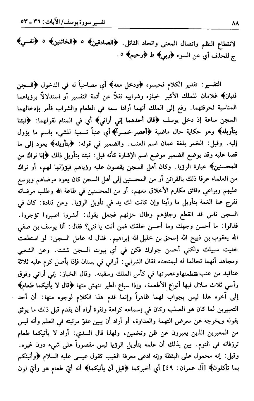 تقدير الكلام فحبسوه وَدَخَلَ مَعَهُ أي مصاحبا له في الدخول السِّجْنَ فَتَيانِ غلامان للملك الأكبر خبازه وشرابيه نقلا عن أئمة التفسير أو استدلالا برؤياهما المناسبة لحرفتهما. رفع إلى الملك أنهما أراد سمه في الطعام والشراب فأمر بإدخالهما السجن ساعة إذ دخل يوسف قالَ أَحَدُهُما إِنِّي أَرانِي أي في المنام لقولهما: نَبِّئْنا بِتَأْوِيلِهِ وهو حكاية حال ماضية أَعْصِرُ خَمْراً أي عنبا تسمية للشيء باسم ما يؤول إليه. وقيل: الخمر بلغة عمان اسم العنب. والضمير في قوله: بِتَأْوِيلِهِ يعود إلى ما قصا عليه وقد يوضع الضمير موضع اسم الإشارة كأنه قيل: نبئنا بتأويل ذلك إِنَّا نَراكَ مِنَ الْمُحْسِنِينَ عبارة الرؤيا. وكان أهل السجن يقصون عليه رؤياهم فيؤوّلها لهم، أو نراك من العلماء عرفا ذلك بالقرائن أو من المحسنين إلى أهل السجن كان يعود مرضاهم ويوسع عليهم ويراعي دقائق مكارم الأخلاق معهم، أو من المحسنين في طاعة الله وطلب مرضاته ففرج عنا الغمة بتأويل ما رأينا وإن كانت لك يد في تأويل الرؤيا.