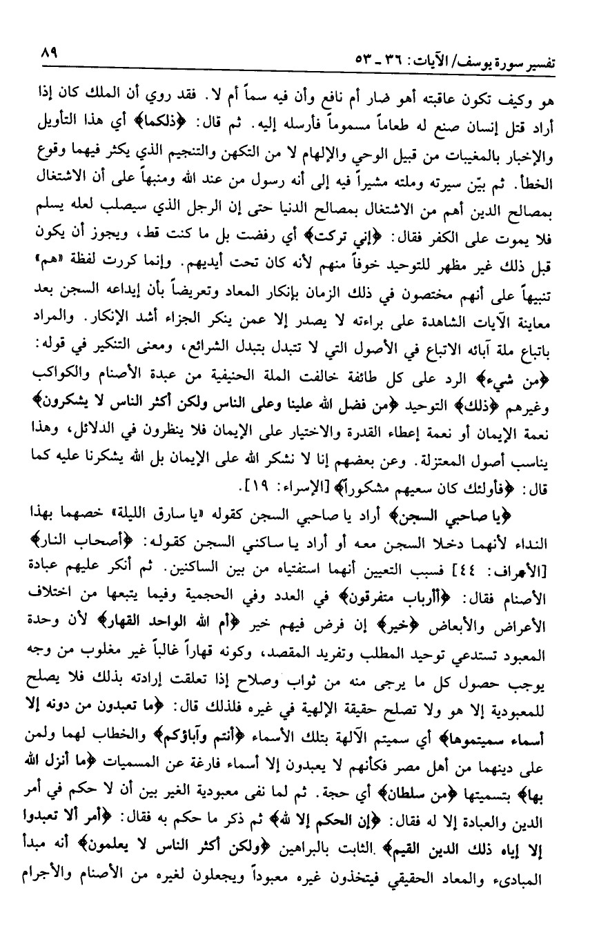 يا صاحِبَيِ السِّجْنِ أراد يا صاحبي السجن كقوله «يا سارق الليلة» خصهما بهذا النداء لأنهما دخلا السجن معه أو أراد يا ساكني السجن كقوله: أَصْحابَ النَّارِ [الأعراف: 44] فسبب التعيين أنهما استفتياه من بين الساكنين. ثم أنكر عليهم عبادة الأصنام فقال: أَأَرْبابٌ مُتَفَرِّقُونَ في العدد وفي الحجمية وفيما يتبعها من اختلاف الأعراض والأبعاض خَيْرٌ إن فرض فيهم خير أَمِ اللَّهُ الْواحِدُ الْقَهَّارُ لأن وحدة المعبود تستدعي توحيد المطلب وتفريد المقصد، وكونه قهارا غالبا غير مغلوب من وجه يوجب حصول كل ما يرجى منه من ثواب وصلاح إذا تعلقت إرادته بذلك فلا يصلح للمعبودية إلا هو ولا تصلح حقيقة الإلهية في غيره فلذلك قال: ما تَعْبُدُونَ مِنْ دُونِهِ إِلَّا أَسْماءً سَمَّيْتُمُوها أي سميتم الآلهة بتلك الأسماء أَنْتُمْ وَآباؤُكُمْ والخطاب لهما ولمن على دينهما من أهل مصر فكأنهم لا يعبدون إلا أسماء فارغة عن المسميات ما أَنْزَلَ اللَّهُ بِها بتسميتها مِنْ سُلْطانٍ أي حجة. ثم لما نفى معبودية الغير بين أن لا حكم في أمر الدين والعبادة إلا له فقال: إِنِ الْحُكْمُ إِلَّا لِلَّهِ ثم ذكر ما حكم به فقال: أَمَرَ أَلَّا تَعْبُدُوا إِلَّا إِيَّاهُ ذلِكَ الدِّينُ الْقَيِّمُ الثابت بالبراهين وَلكِنَّ أَكْثَرَ النَّاسِ لا يَعْلَمُونَ أنه مبدأ المبادئ والمعاد الحقيقي فيتخذون غيره معبودا ويجعلون لغيره من الأصنام والأجرام