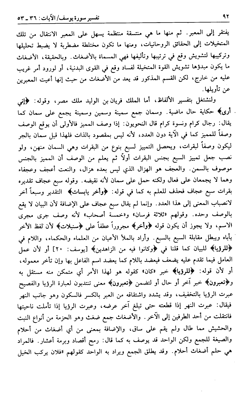 ولنشتغل بتفسير الألفاظ، أما الملك فريان بن الوليد ملك مصر، وقوله: إِنِّي أَرى حكاية حال ماضية. وسمان جمع سمينة وسمين وسمينة يجمع على سمان كما يقال: رجال كرام ونسوة كرام قال النحويون: إذا وصف المميز فالأولى أن يوقع الوصف وصفا للمميز كما في الآية دون العدد، لأنه ليس بمقصود بالذات فلهذا قيل سمان بالجر ليكون وصفا لبقرات، ويحصل التمييز لسبع بنوع من البقرات وهي السمان منهن، ولو نصب جعل تمييز السبع بجنس البقرات أولا ثم يعلم من الوصف أن المميز بالجنس موصوف بالسمن. والعجف هو الهزال الذي ليس بعده هزال، والنعت أعجف وعجفاء وهما لا يجمعان على فعال ولكنه حمل على سمان لأنه نقيضه. وقوله سبع عجاف تقديره بقرات سبع عجاف فحذف للعلم به كما في قوله: وَأُخَرَ يابِساتٍ التقدير وسبعا أخر لانصباب المعنى إلى هذا العدد. وإنما لم يقال سبع عجاف على الإضافة لأن البيان لا يقع بالوصف وحده. وقولهم «ثلاثة فرسان» و «خمسة أصحاب» لأنه وصف جرى مجرى الاسم، ولا يجوز أن يكون قوله وَأُخَرَ مجرورا عطفا على سُنْبُلاتٍ لأن لفظ الأخر يأباه ويبطل مقابلة السبع بالسبع. وأراد بالملأ الأعيان من العلماء والحكماء، واللام في لِلرُّءْيا للبيان كما قلنا في وَكانُوا فِيهِ مِنَ الزَّاهِدِينَ [يوسف: 20] أو لأن عمل العامل فيما تقدم عليه يضعف فيعضد باللام كما يعضد اسم الفاعل بها وإن تأخر معموله، أو لأن قوله: لِلرُّءْيا خبر «كان» كقوله هو لهذا الأمر أي متمكن منه مستقل به وتَعْبُرُونَ خبر آخر أو حال أو لتضمن تَعْبُرُونَ معنى تنتدبون لعبارة الرؤيا والفصيح عبرت الرؤيا بالتخفيف، وقد يشدد واشتقاقه من العبر بالكسر فالسكون وهو جانب النهر فيقال: عبرت النهر إذا قطعته حتى تبلغ آخر عرضه، وعبرت الرؤيا إذا تأملت ناحيتها فانتقلت من أحد الطرفين إلى الآخر. والأضغاث جمع ضغث وهو الحزمة من أنواع النبت والحشيش مما طال ولم يقم على ساق، والإضافة بمعنى من أي أضغاث من أحلام والصيغة للجمع ولكن الواحد قد يوصف به كما قال: رمح أقصاد وبرمة أعشار. فالمراد هي حلم أضغاث أحلام. وقد يطلق الجمع ويراد به الواحد كقولهم «فلان يركب الخيل