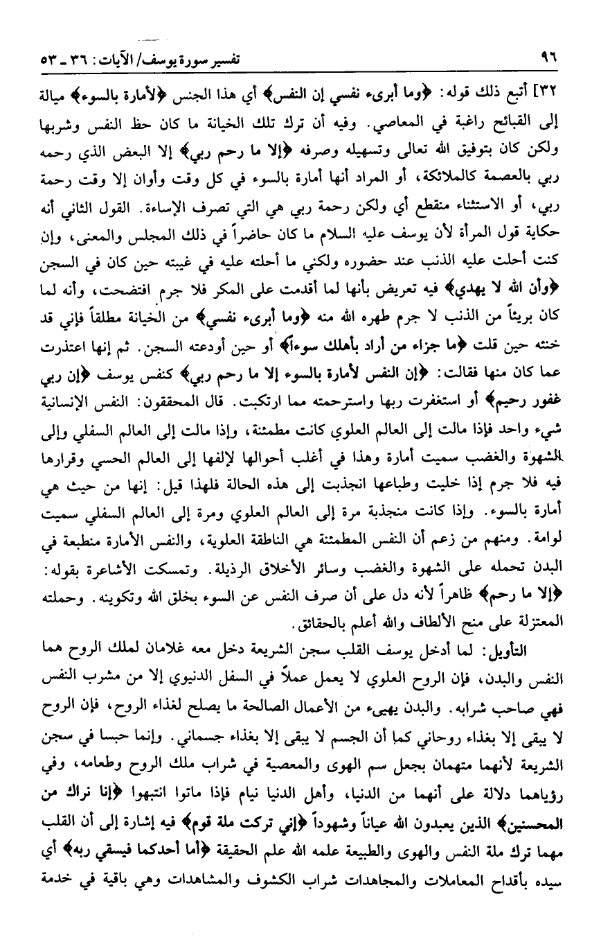 32] أتبع ذلك قوله: وَما أُبَرِّئُ نَفْسِي إِنَّ النَّفْسَ أي هذا الجنس لَأَمَّارَةٌ بِالسُّوءِ ميالة إلى القبائح راغبة في المعاصي. وفيه أن ترك تلك الخيانة ما كان حظ النفس وشربها ولكن كان بتوفيق الله تعالى وتسهيله وصرفه إِلَّا ما رَحِمَ رَبِّي إلا البعض الذي رحمه ربي بالعصمة كالملائكة، أو المراد أنها أمارة بالسوء في كل وقت وأوان إلا وقت رحمة ربي، أو الاستثناء منقطع أي ولكن رحمة ربي هي التي تصرف الإساءة. القول الثاني أنه حكاية قول المرأة لأن يوسف عليه السلام ما كان حاضرا في ذلك المجلس والمعنى، وإن كنت أحلت عليه الذنب عند حضوره ولكني ما أحلته عليه في غيبته حين كان في السجن وَأَنَّ اللَّهَ لا يَهْدِي فيه تعريض بأنها لما أقدمت على المكر فلا جرم افتضحت، وأنه لما كان بريئا من الذنب لا جرم طهره الله منه وَما أُبَرِّئُ نَفْسِي من الخيانة مطلقا فإني قد خنثه حين قلت ما جَزاءُ مَنْ أَرادَ بِأَهْلِكَ سُوءاً أو حين أودعته السجن. ثم إنها اعتذرت عما كان منها فقالت: إِنَّ النَّفْسَ لَأَمَّارَةٌ بِالسُّوءِ إِلَّا ما رَحِمَ رَبِّي كنفس يوسف إِنَّ رَبِّي غَفُورٌ رَحِيمٌ أو استغفرت ربها واسترحمته مما ارتكبت. قال المحققون: النفس الإنسانية شيء واحد فإذا مالت إلى العالم العلوي كانت مطمئنة، وإذا مالت إلى العالم السفلي وإلى الشهوة والغضب سميت أمارة وهذا في أغلب أحوالها لإلفها إلى العالم الحسي وقرارها فيه فلا جرم إذا خليت وطباعها انجذبت إلى هذه الحالة فلهذا قيل: إنها من حيث هي أمارة بالسوء. وإذا كانت منجذبة مرة إلى العالم العلوي ومرة إلى العالم السفلي سميت لوامة. ومنهم من زعم أن النفس المطمئنة هي الناطقة العلوية، والنفس الأمارة منطبعة في البدن تحمله على الشهوة والغضب وسائر الأخلاق الرذيلة. وتمسكت الأشاعرة بقوله:
