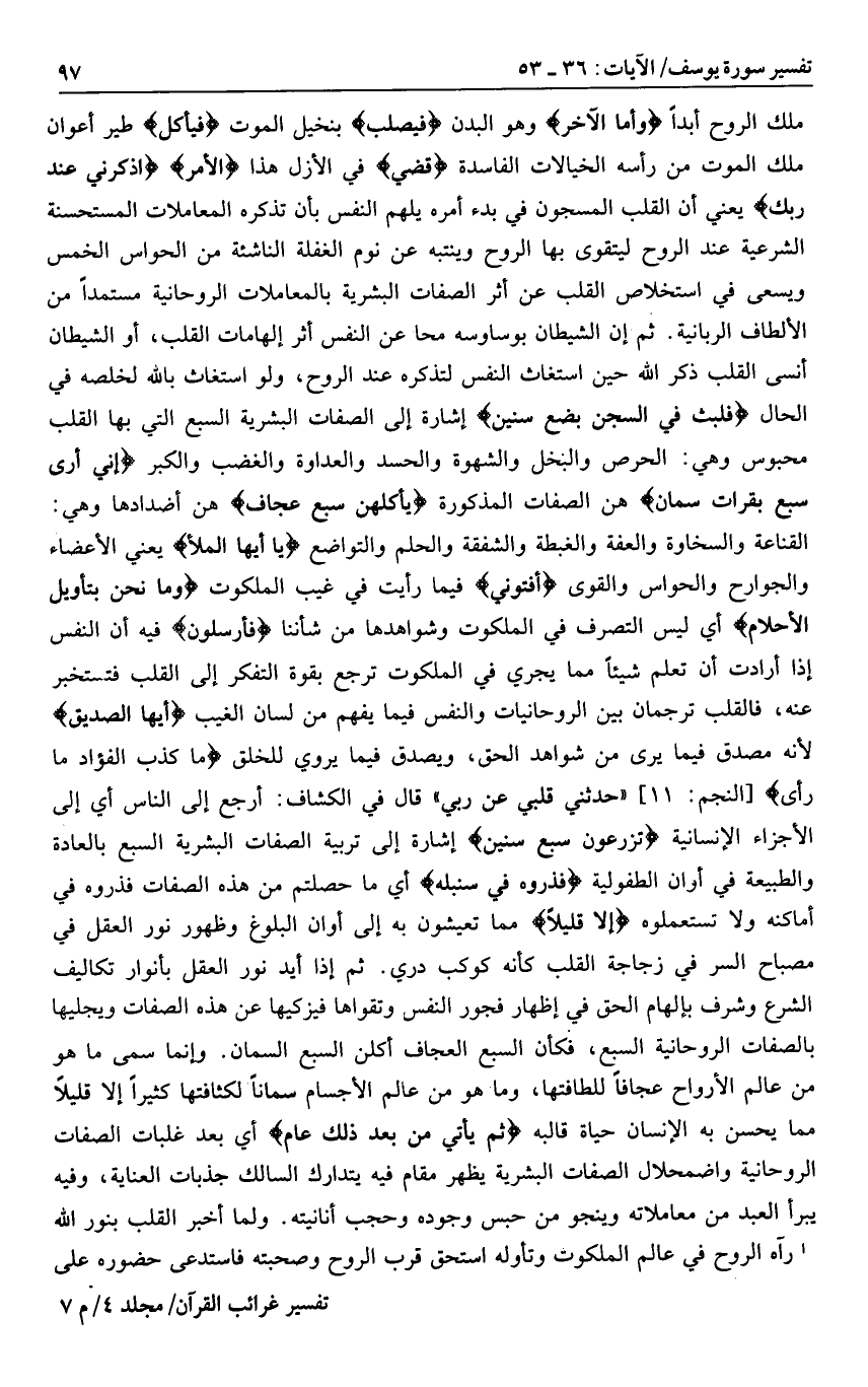 قال في الكشاف: أرجع إلى الناس أي إلى الأجزاء الإنسانية تَزْرَعُونَ سَبْعَ سِنِينَ إشارة إلى تربية الصفات البشرية السبع بالعادة والطبيعة في أوان الطفولية فَذَرُوهُ فِي سُنْبُلِهِ أي ما حصلتم من هذه الصفات فذروه في أماكنه ولا تستعملوه إِلَّا قَلِيلًا مما تعيشون به إلى أوان البلوغ وظهور نور العقل في مصباح السر في زجاجة القلب كأنه كوكب دري. ثم إذا أيد نور العقل بأنوار تكاليف الشرع وشرف بإلهام الحق في إظهار فجور النفس وتقواها فيزكيها عن هذه الصفات ويجليها بالصفات الروحانية السبع، فكأن السبع العجاف أكلن السبع السمان. وإنما سمى ما هو من عالم الأرواح عجافا للطافتها، وما هو من عالم الأجسام سمانا لكثافتها كثيرا إلا قليلا مما يحسن به الإنسان حياة قالبه ثُمَّ يَأْتِي مِنْ بَعْدِ ذلِكَ عامٌ أي بعد غلبات الصفات الروحانية واضمحلال الصفات البشرية يظهر مقام فيه يتدارك السالك جذبات العناية، وفيه يبرأ العبد من معاملاته وينجو من حبس وجوده وحجب أنانيته. ولما أخبر القلب بنور الله؟؟؟ رآه الروح في عالم الملكوت وتأوله استحق قرب الروح وصحبته فاستدعى حضوره على