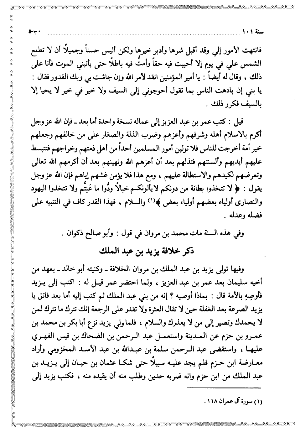 قيل كتب عمر بن عبد العزيز إلى عماله نسخة واحدة أما بعد فإن الله عز وجل أكرم بالإسلام أهله وشرفهم وأعزهم وضرب الذلة والصغار على من خالفهم وجعلهم خير أمة أخرجت للناس فلا تولين أمور المسلمين أحدا من أهل ذمتهم وخراجهم فتتبسط عليهم أيديهم وألسنتهم فتذلهم بعد أن أعزهم لله وتهينهم بعد أن أكرمهم الله تعالى وتعرضهم لكيدهم والاستطالة عليهم ومع هذا فلا يؤمن غشهم إياهم فإن الله عز وجل يقول { لا تتخذوا بطانة من دونكم لا يألونكم خبالا ودوا ما عنتم } { لا تتخذوا اليهود والنصارى أولياء بعضهم أولياء بعض } والسلام فهذا القدر كاف في التنبيه على فضله وعدله