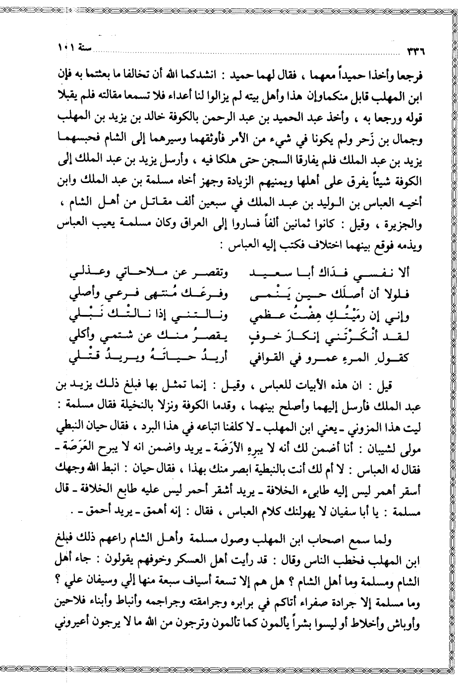 قيل ان هذه الأبيات للعباس وقيل إنما تمثل بها فبلغ ذلك يزيد بن عبد الملك فأرسل إليهما وأصلح بينهما وقدما الكوفة ونزلا بالنخيلة فقال مسلمة ليت هذا المزوني يعني ابن المهلب لا كلفنا اتباعه في هذا البرد فقال حيان النبطي مولى لشيبان أنا أضمن لك أن لا يبره الأرضة يريد واضمن انه لا يبرح العرصة فقال له العباس لا أم لك أنت بالنبطية ابصر منك بهذا فقال حيان انبط الله وجهك أسقر أهمر ليس إليه طابئ الخلافة يريد أشقر أحمر ليس عليه طابع الخلافة قال مسلمة يا أبا سفيان لا يهولنك كلام العباس فقال إنه أهمق يريد أحمق
