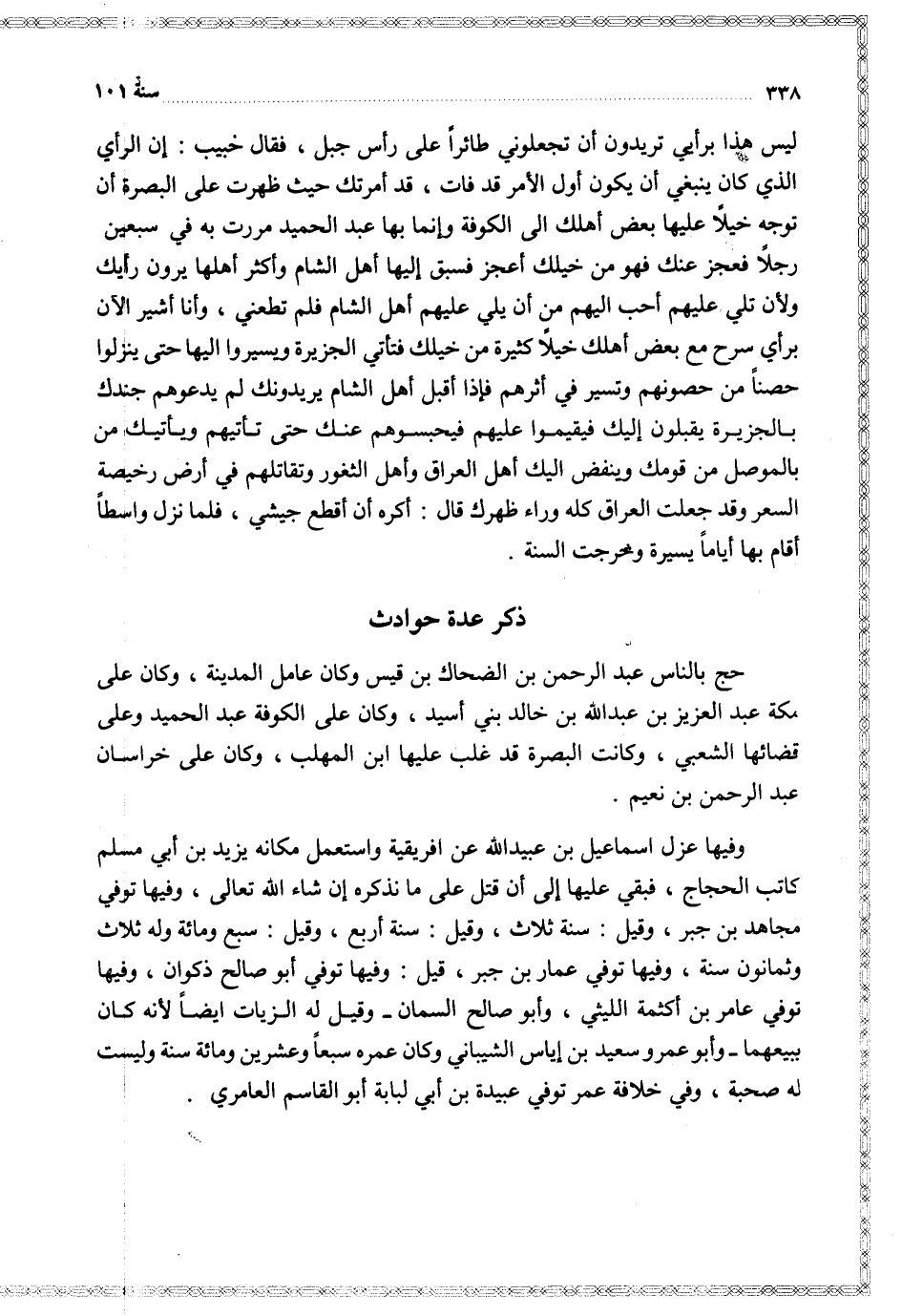 وفيها عزل اسماعيل بن عبيد الله عن افريقية واستعمل مكانه يزيد بن أبي مسلم كاتب الحجاج فبقي عليها إلى أن قتل على ما نذكره إن شاء الله تعالى وفيها توفي مجاهد بن جبر وقيل سنة ثلاث وقيل سنة أربع وقيل سبع ومائة وله ثلاث وثمانون سنة وفيها توفي عمار بن جبر قيل وفيها توفي أبو صالح ذكوان وفيها توفي عامر بن أكثمة الليثي وأبو صالح السمان وقيل له الزيات ايضا لأنه كان ببيعهما وأبو عمرو سعيد بن إياس الشيباني وكان عمره سبعا وعشرين ومائة سنة وليست له صحبة وفي خلافة عمر توفي عبيدة بن أبي لبابة أبو القاسم العامري