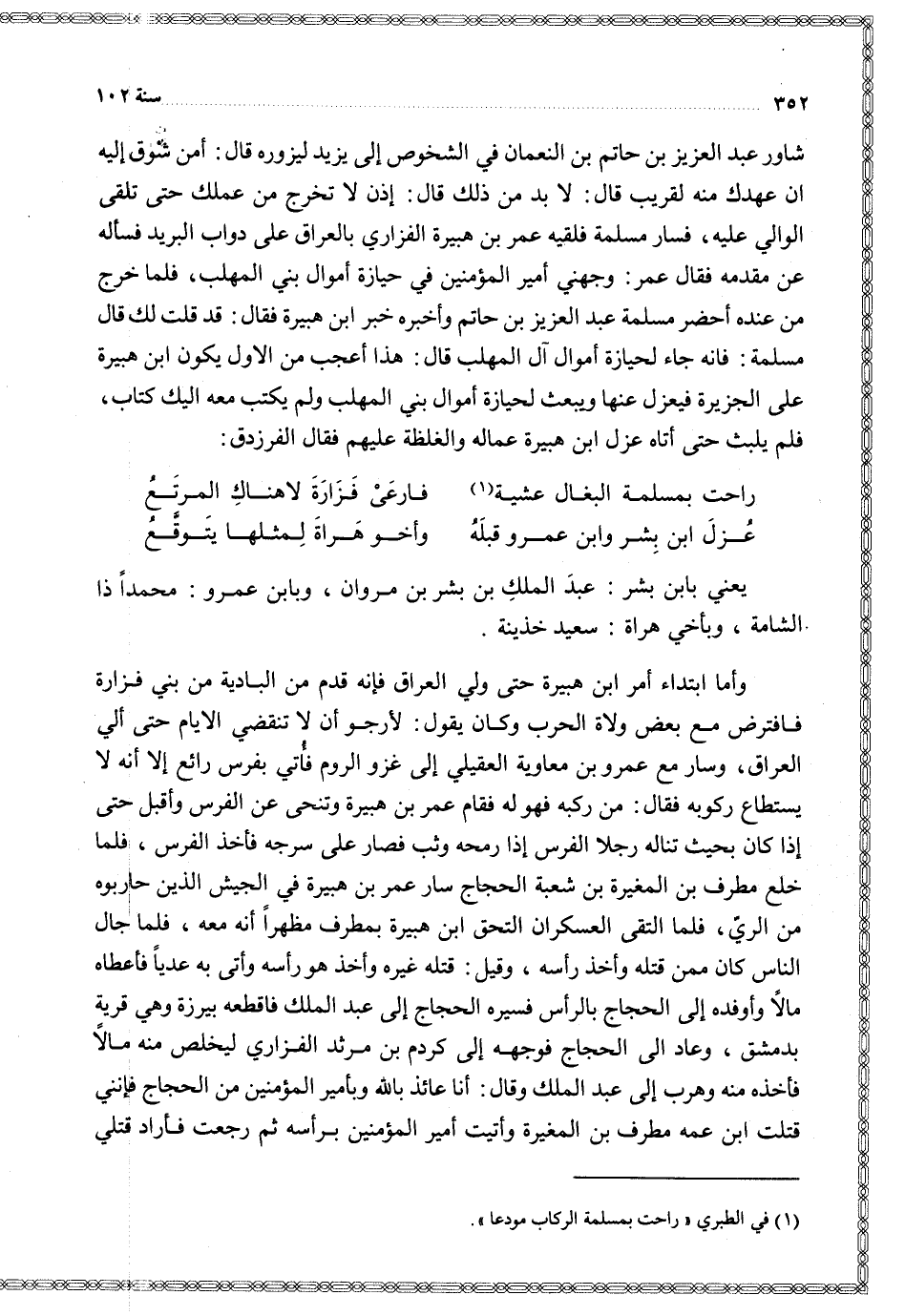 شاور عبد العزيز بن حاتم بن النعمان في الشخوص إلى يزيد ليزوره قال أمن شوق إليه ان عهدك منه لقريب قال لا بد من ذلك قال إذن لا تخرج من عملك حتى تلقى الوالي عليه فسار مسلمة فلقيه عمر بن هبيرة الفزاري بالعراق على دواب البريد فسأله عن مقدمه فقال عمر وجهني أمير المؤمنين في حيازة أموال بني المهلب فلما خرج من عنده أحضر مسلمة بن عبد العزيز بن حاتم وأخبره خبر ابن هبيرة فقال قد قلت لك قال مسلمة فإنه جاء لحيازة أموال آل المهلب قال هذا أعجب من الأول يكون ابن هبيرة على الجزيرة فيعزل عنها ويبعث لحيازة أموال بني المهلب ولم يكتب معه إليك كتاب فلم يلبث حتى أتاه عزل ابن هبيرة عماله والغلظة عليهم فقال الفرزدق