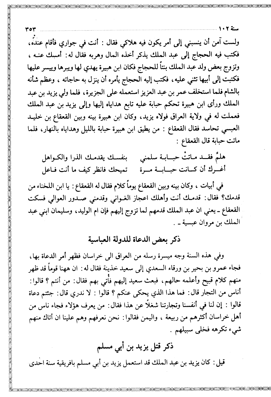 وفي هذه السنة يسر ميسرة رسله من العراق إلى خراسان فظهر أمر الدعاة بها فجاء عمرو بن بحير بن ورقاء السعدي إلى سعيد خذينة فقال له ان ههنا قوما قد ظهر منهم كلام قبيح وأعلمه حالهم فبعث سعيد إليهم فأتي بهم فقال من أنتم قالوا أناس من التجار قال فما هذا الذي يحكى عنكم قالوا لا ندري قال جئتم دعاة قالوا ان لنا في أنفسنا وتجارتنا شغلا عن هذا فقال من يعرف هؤلاء فجاء ناس من أهل خراسان أكثرهم من ربيعة واليمن فقالوا نحن نعرفهم وهم علينا إن أتاك منهم شيء تكرهه فخلى سبيلهم