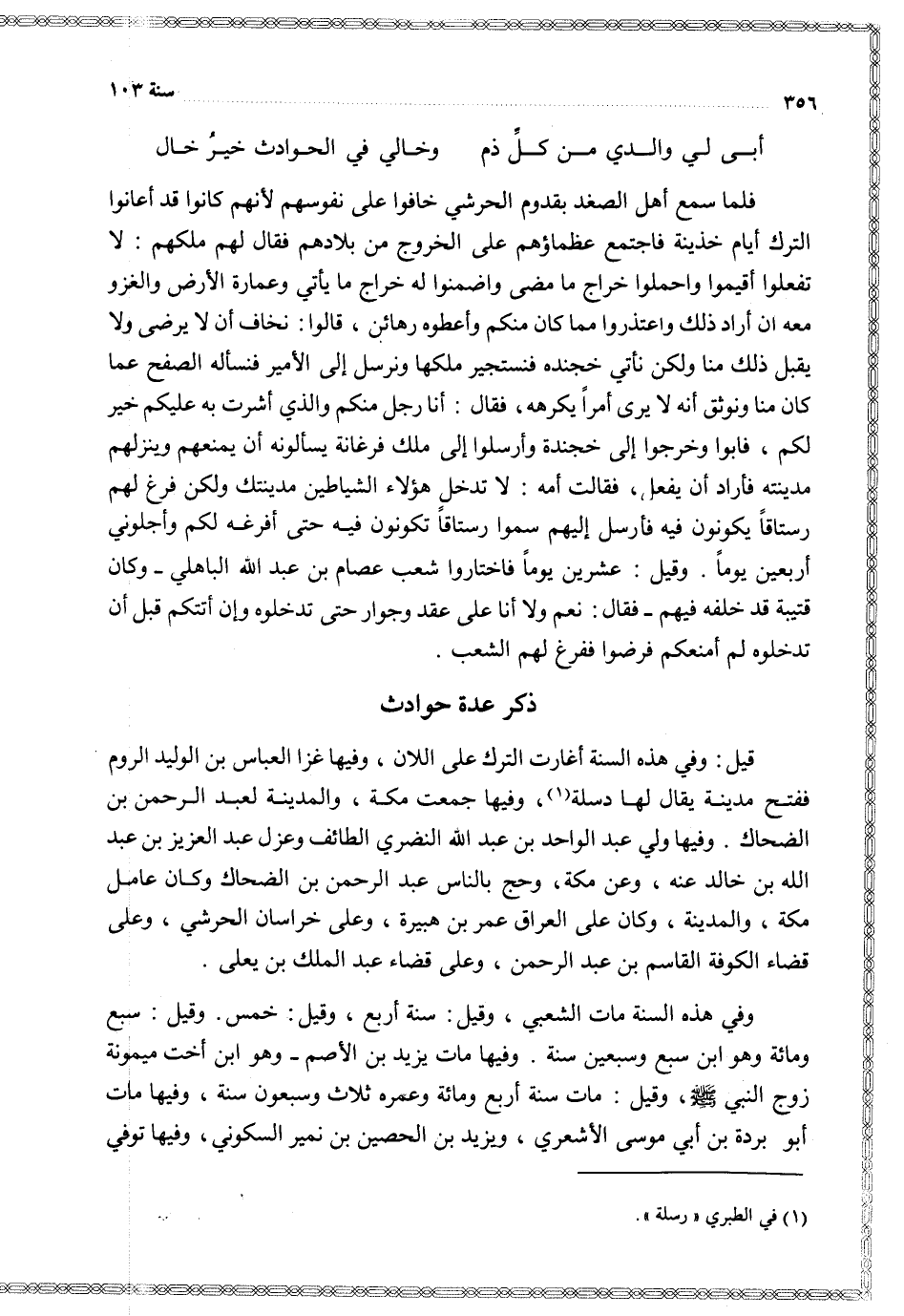 وفي هذه السنة مات الشعبي وقيل سنة أربع وقيل خمس وقيل سبع ومائة وهو ابن سبع وسبعين سنة وفيها مات يزيد بن الأصم وهو ابن أخت ميمونة زوج النبي وقيل مات سنة أربع ومائة وعمره ثلاث وسبعون سنة وفيها مات أبو بردة بن أبي موسى الأشعري ويزيد بن الحصين بن نمير السكوني وفيها توفي