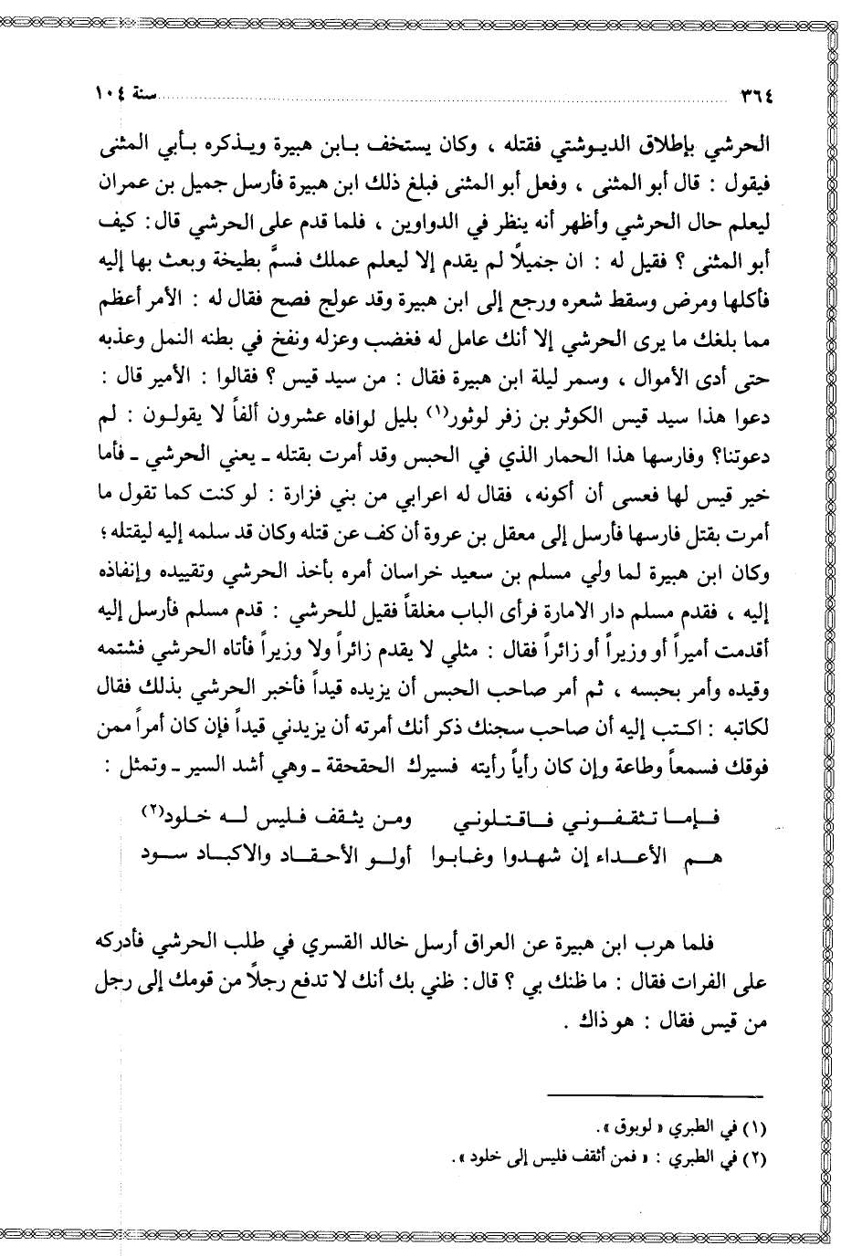 الحرشي بإطلاق الديوشتي فقتله وكان يستخف بابن هبيرة ويذكره بأبي المثنى فيقول قال أبو المثنى وفعل أبو المثنى فبلغ ذلك ابن هبيرة فأرسل جميل بن عمران ليعلم حال الحرشي وأظهر أنه ينظر في الدواوين فلما قدم على الحرشي قال كيف أبو المثنى فقيل له أن جميلا لم يقدم إلا ليعلم عملك فسم بطيخة وبعث بها إليه فأكلها ومرض وسقط شعره ورجع إلى ابن هبيرة وقد عولج فصح فقال له الأمر أعظم مما بلغك ما يرى الحرشي إلا انك عامل له فغضب وعزله ونفخ في بطنه النمل وعذبه حتى أدى الأموال وسمر ليلة ابن هبيرة فقال من سيد قيس فقالوا الأمير قال دعوا هذا سيد قيس الكوثر بن زفر لوثور بليل لوافاه عشرون ألفا لا يقولون لم دعوتنا وفارسها هذا الحمار الذي في الحبس وقد أمرت بقتله يعني الحرشي فأما خير قيس لها فعسى أن أكونه فقال له أعرابي من بني فزارة لو كنت كما تقول ما أمرت بقتل فارسها فأرسل إلى معقل بن عروة أن كف عن قتله وكان قد سلمه إليه ليقتله وكان ابن هبيرة لما ولي مسلم بن سعيد خراسان أمره بأخذ الحرشي وتقييده وإنفاذه إليه فقدم مسلم دار الإمارة فرأى الباب مغلقا فقيل للحرشي قدم مسلم فأرسل إليه أقدمت أميرا أو وزيرا أو زائرا فقال مثلي لا يقدم زائرا ولا وزيرا فأتاه الحرشي فشتمه وقيده وأمر بحبسه ثم أمر صاحب الحبس أن يزيده قيدا فأخبر الحرشي بذلك فقال لكاتبه اكتب إليه أن صاحب سجنك ذكر انك أمرته أن يزيدني قيدا فإن كان أمرا من فوقك فسمعا وطاعة وإن كان رأيا رأيته فسيرك الحقحقة وهي أشد السير وتمثل
