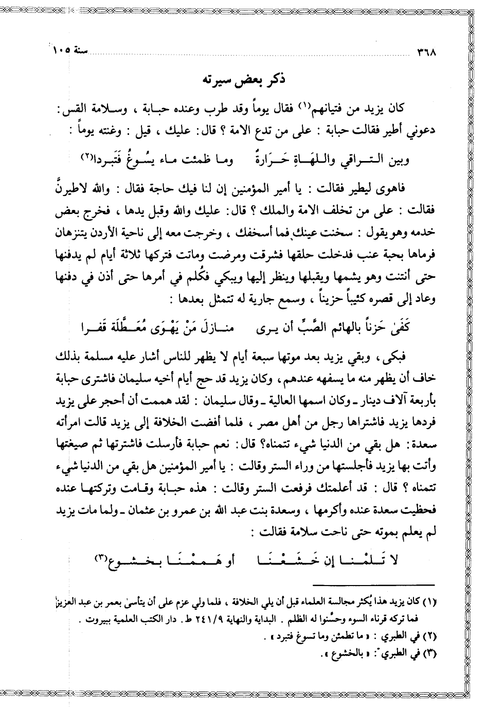 كان يزيد من فتيانهم فقال يوما وقد طرب وعنده حبابة وسلامة القس دعوني أطير فقالت حبابة على من تدع الامة قال عليك قيل وغنته يوما