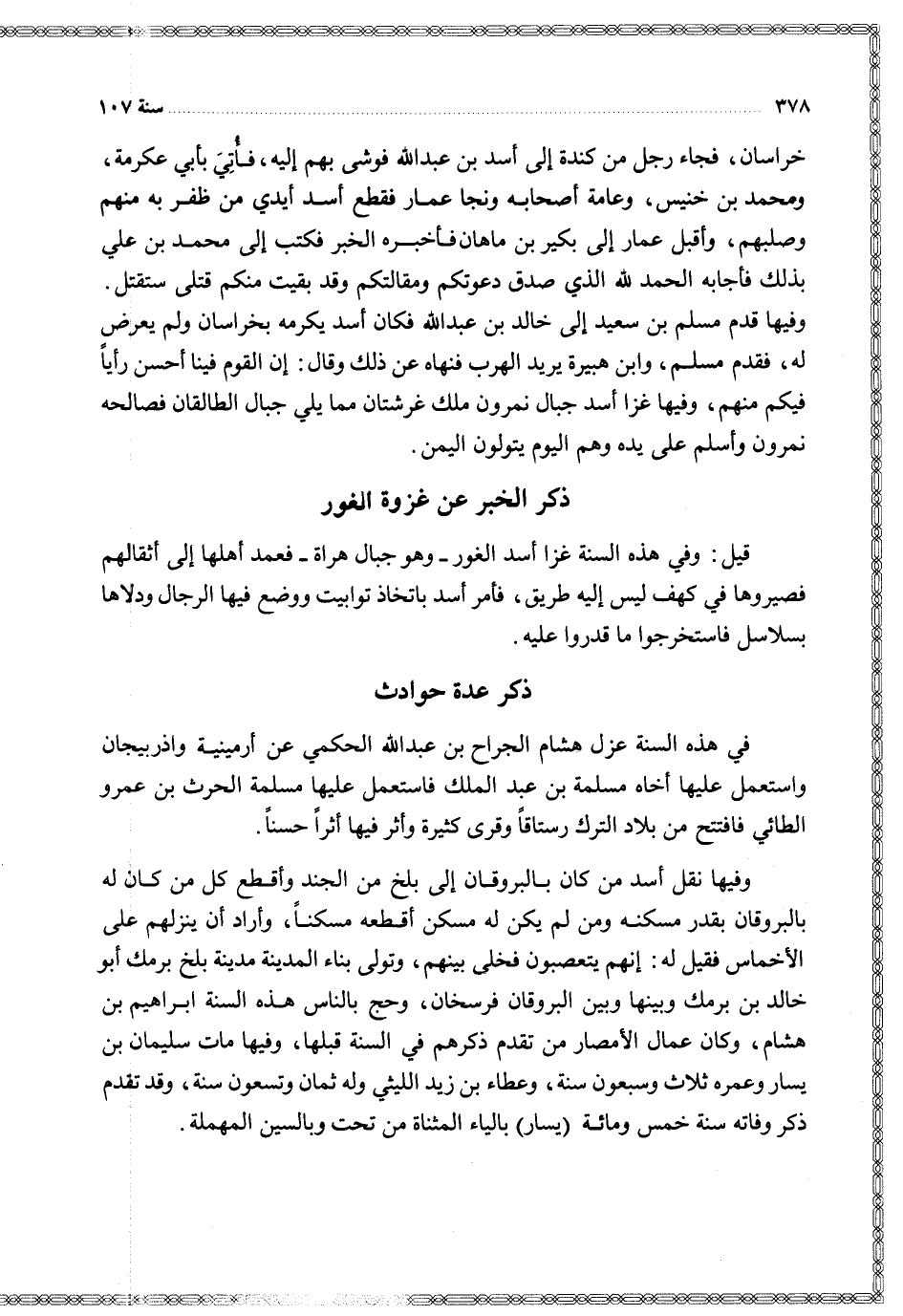 خراسان فجاء من كندة إلى أسد بن عبد الله فوشى بهم إليه فأتي بأبي عكرمة ومحمد بن خنيس وعامة أصحابه ونجا عمار فقطع أسد أيدي من ظفر به منهم وصلبهم وأقبل عمار إلى بكير بن ماهان فأخبره الخبر فكتب إلى محمد بن علي بذلك فأجابه الحمد لله الذي صدق دعوتكم ومقالتكم وقد بقيت منكم قتلى ستقتل وفيها قدم مسلم به سعيد إلى خالد بن عبد الله فكان أسد يكرمه بخراسان ولم يعرض له فقدم مسلم وابن هبيرة يريد الهرب فنهاه عن ذلكوقال إن القوم فينا أحسن رأيا فيكم منهم وفيها غزا أسد جبال نمرون ملك غرشتان مما يلي جبال الطالقان فصالحة نمرون وأسلم على يده وهم اليوم يتولون اليمن