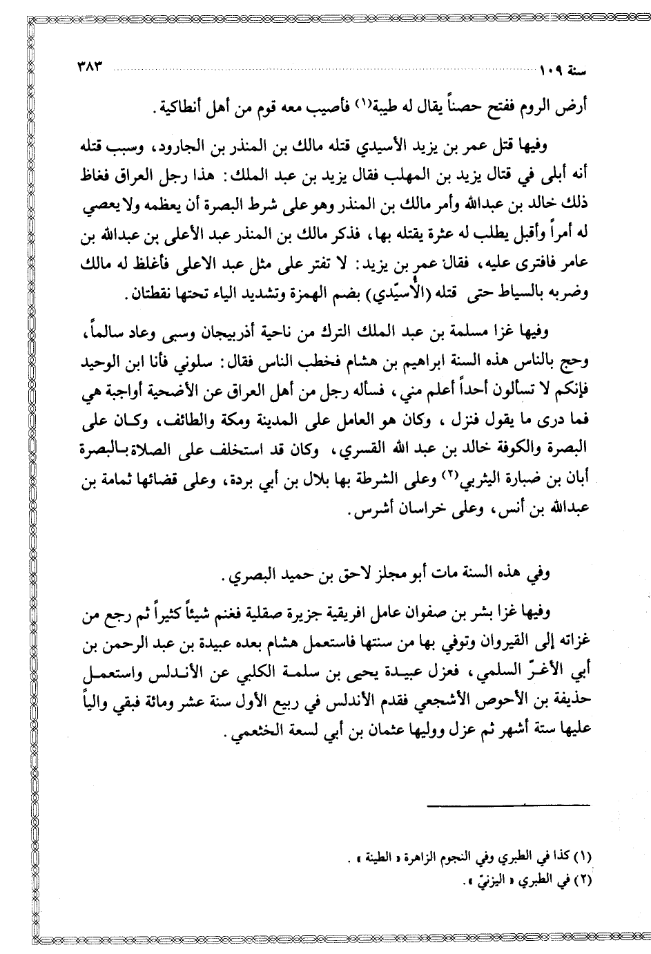 وفيها قتل عمر بن يزيد الأسيدي قتله مالك بن المنذر بن الجارود وسبب قتله أنه أبلى في قتال يزيد بن المهلب فقال يزيد بن عبد الملك هذا رجل العراق فغاظ ذلك خالد بن عبد الله وأمر مالك بن المنذر وهو على شرط البصرة أن يعظمه ولا يعصي له أمرا وأقبل يطلب له عثرة يقتله بها فذكر مالك بن المنذر بن عبد الأعلى بن عبد الله بن عامر فافترى عليه فقال عمر بن يزيد لا تفتر على مثل عبد الأعلى فأغلظ له مالك وضربه بالسياط حتى قتله الأسيدي بضم الهمزة وتشديد الياء تحتها نقطتان