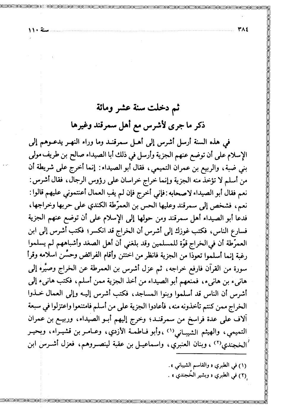 في هذه السنة أرسل أشرس إلى أهل سمرقند وما وراء النهر يدعوهم إلى الإسلام على أن توضع عنهم الجزية وأرسل في ذلك أبا الصيداء صالح بن طريف مولى بني ضبة والربيع بن عمران التميمي فقال أبو الصيداء إنما أخرج على شريطة أن من أسلم لا تؤخذ منه الجزية إل إنما خراج خراسان على رؤوس الرجال فقال أشرس نعم فقال أبو الصيداء لاصحابه فإني أخرج فإن لم يف العمال أعنتموني عليهم قالوا فشخص إلى سمرقند وعليها الحس بن العمرطة الكندي على حربها وخراجها فدعا أبو الصيدا أهل سمرقند ومن حولها إلى الإسلام على أن توضع عنهم الجزية فسارع الناس فكتب غوزك إلى أشرس أن الخراج قد انكسر فكتب أشرس إلى ابن العمرطة أن في الخراج قوة للمسلمين وقد بلغني أن أهل الصغد وأشباههم لم يسلموا رغبة إنما أسلموا تعوذا من الجزية فانظر من اختتن وأقام الفرائض وحسن اسلامه وقرأ سورة من القران فارفع خراجه ثم عزل أشرس بن العرمطة عن الخراج وصيره إلى هانئ بن هانئ فمنعهم أبو الصيداء من أخذ الجزية ممن أسلم فكتب هانئ إلى أشرس أن الناس قد اسلموا وبنوا المساجد فكتب أشرس إليه وإلى العمال خذوا الخراج ممن كنتم تأخذونه منه فأعادوا الجزية على من أسلم فامتنعوا واعتزلوا في سبعة آلاف على عدة فراسخ من سمرقند وخرج إليهم أبو الصيداء وربيع بن عمران التميمي والهيثم الشيباني وابو فاطمة الأزدي وعامر بن قشيراء وبحير الخجندي وبنان العنبري واسماعيل بن عقبة لينصرهم فعزل أشرس ابن