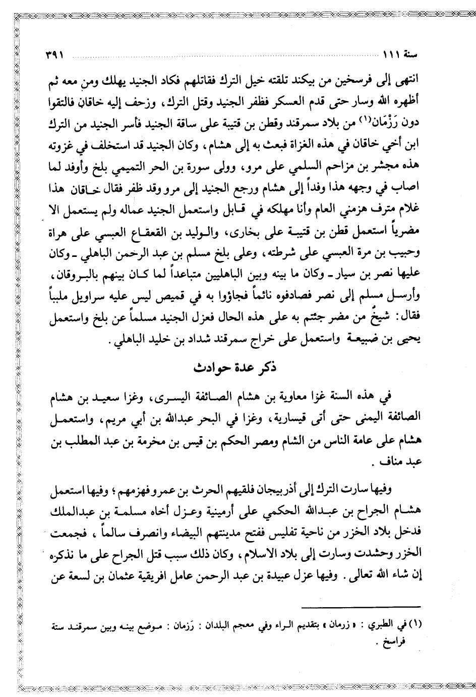 انتهى إلى فرسخين من بيكند تلقته خيل الترك فقاتلهم فكاد الجنيد يهلك ومن معه ثم أظهره الله وسار حتى قدم العسكر فظفر الجنيد وقتل الترك وزحف إليه خاقان فالتقوا دون رزمان من بلاد سمرقند وقطن بن قتيبة على ساقة الجنيد فأسر الجنيد من الترك ابن أخي خاقان في هذه الغزاة فبعث به إلى هشام وكان الجنيد قد استخلف في غزوته هذه مجشر بن مزاحم السلمي على مرو وولى سورة بن الحر التميمي بلخ وأوفد لما اصاب في وجهه هذا وفدا إلى هشام ورجع الجنيد إلى مرو وقد ظفر فقال خاقان هذا غلام مترف هزمني العام وأنا مهلكه في قابل واستعمل الجنيد عماله ولم يستعمل الا مضريا استعمل قطن بن قتيبة على بخارى والوليد بن القعقاع العبسي على هراة وحبيب بن مرة العبسي على شرطته وعلى بلخ مسلم بن عبد الرحمن الباهلي وكان عليها نصر بن سيار وكان ما بينة وبين الباهليين متباعدا لما كان بينهم بالبروقان وأرسل مسلم إلى نصر فصادفوه نائما فجاؤوا به في قميص ليس عليه سراويل ملببا فقال شيخ من مضر جئتم به على هذه الحال فعزل الجنيد مسلما عن بلخ واستعمل يحيى بن ضبيعة واستعمل على خراج سمرقند شداد بن خليد الباهلي