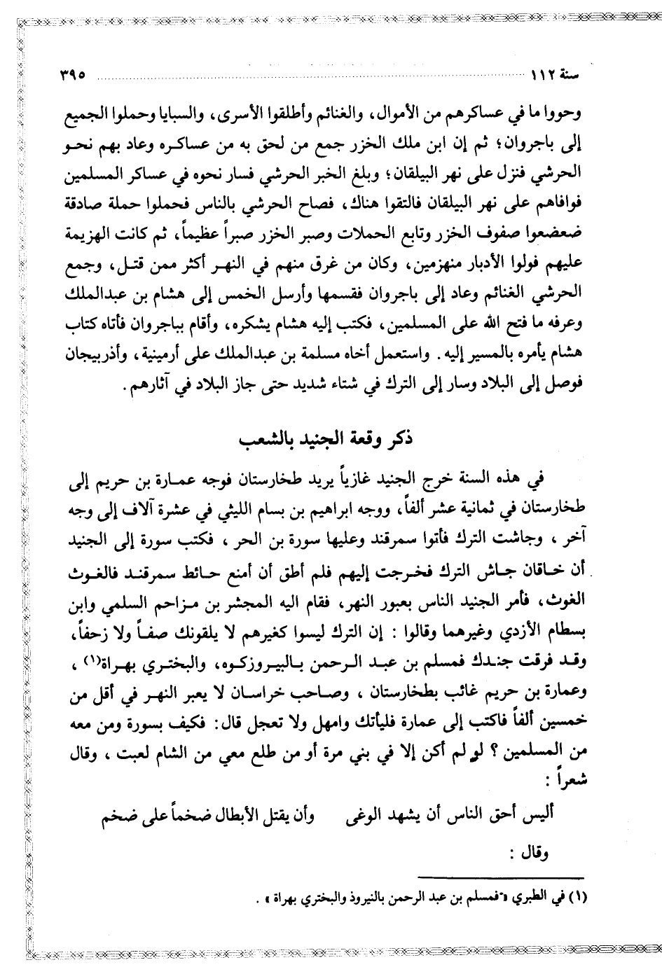 وحووا ما في عساكرهم من الأموال والغنائم وأطلقوا الأسرى والسبايا وحملوا الجميع إلى باجروان ثم ان ابن ملك الخزر جمع من لحق به من عساكره وعاد بهم نحو الحرشي فنزل على نهر البيلقان وبلغ الخبر الحرشي فسار نحوه في عساكر المسلمين فوافاهم على نهر البيلقان فالتقوا هناك فصاح الحرشي بالناس فحملوا حملة صادقة ضعضعوا صفوف الخزر وتابع الحملات وصبر الخزر صبرا عظيما ثم كانت الهزيمة عليهم فولوا الأدبار منهزمين وكان من غرق منهم في النهر أكثر ممن قتل وجمع الحرشي الغنائم وعاد إلى باجروان فقسمها وأرسل الخمس إلى هشام بن عبد الملك وعرفه ما فتح الله على المسلمين فكتب إليه هشام يشكره وأقام بباجروان فأتاه كتاب هشام يأمره بالمسير إليه واستعمل أخاه مسلمة بن عبد الملك على أرمينية وأذربيجان فوصل إلى البلاد وسار إلى الترك في شتاء شديد حتى جاز البلاد في آثارهم