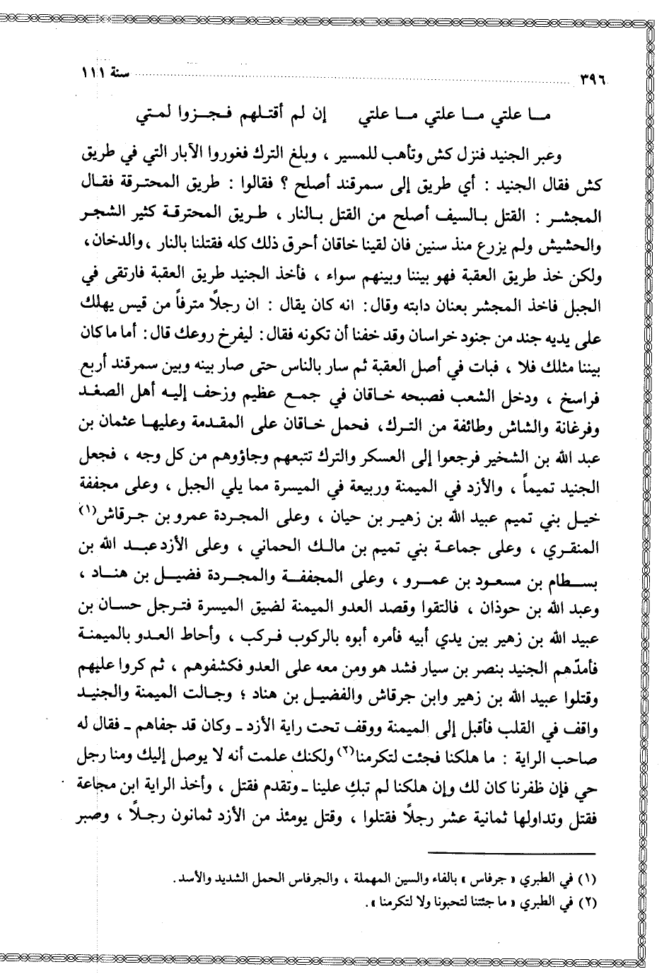 وعبر الجنيد فنزل كش وتأهل للمسير بلغ الترك فغوروا الآبار التي في طريق كش فقال الجنيد أي طريق إلى سمرقند أصلح فقالوا طريق المحترقة فقال المجشر القتل بالسيف أصلح من القتل بالنار طريق المحترقة كثير الشجر والحشيش ولم يزرع منذ سنين فان لقينا خاقان أحرق ذلك كله فقتلنا بالنار والدخان ولكن خذ طريق العقبة فهو بيننا وبينهم سواء فأخذ الجنيد طريق العقبة فارتقى في الجبل فاخذ المجشر بعنان دابته وقال انه كان يقال ان رجلا مترفا من قيس يهلك على يديه جند من جنود خراسان وقد خفنا أن تكونه فقال ليفرخ روعك قال أما ما كان بيننا مثلك فلا فبات في أصل العقبة ثم سار بالناس حتى صار بينه وبين سمرقند أربع فراسخ ودخل الشعب فصبحه خاقان في جمع عظيم وزحف إليه أهل الصغد وفرغانة و الشاش وطائفة من الترك فحمل خاقان على المقدمة وعليها عثمان بن عبد الله بن الشخير فرجعوا إلى العسكر والترك تتبعهم وجاؤوهم من كل وجه فجعل الجنيد تميما والأزد في الميمنة وربيعة في الميسرة مما يلي الجبل وعلى مجففة خيل بني تميم عبيد الله بن زهير بن حيان وعلى المجردة عمرو بن جرقاش المنقري وعلى جماعة بني تميم بن مالك الحماني وعلى الأزد عبد الله بن بسطام بن مسعود بن عمرو وعلى المجففة والمجردة فضيل بن هناد وعبد الله بن حوذان فالتقوا وقصد العدو الميمنة لضيق الميسرة فترجل حسان بن عبيد الله بن زهير بين يدي أبيه فأمره أبوه بالركوب فركب وأحاط العدو بالميمنة فأمدهم الجنيد بنصر بن سيار فشد هو ومن معه على العدو فكشفوهم ثم كروا عليهم وقتلوا عبيد الله بن زهير وابن جرقاش والفضيل ين هناد وجالت الميمنة والجنيد واقف في القلب فأقبل إلى الميمنة ووقف تحت راية الأزد وكان قد جفاهم فقال له صاحب الراية ما هلكنا فجئت لتكرمنا ولكنك علمت أنه لا يوصل إليك ومنا رجل حي فإن ظفرنا كان لك وإن هلكنا لم تبك علينا وتقدم فقتل وأخذ الراية ابن مجاعة فقتل وتداولها ثمانية عشر رجلا فقتلوا وقتل يومئذ من الأزد ثمانون رجلا وصبر
