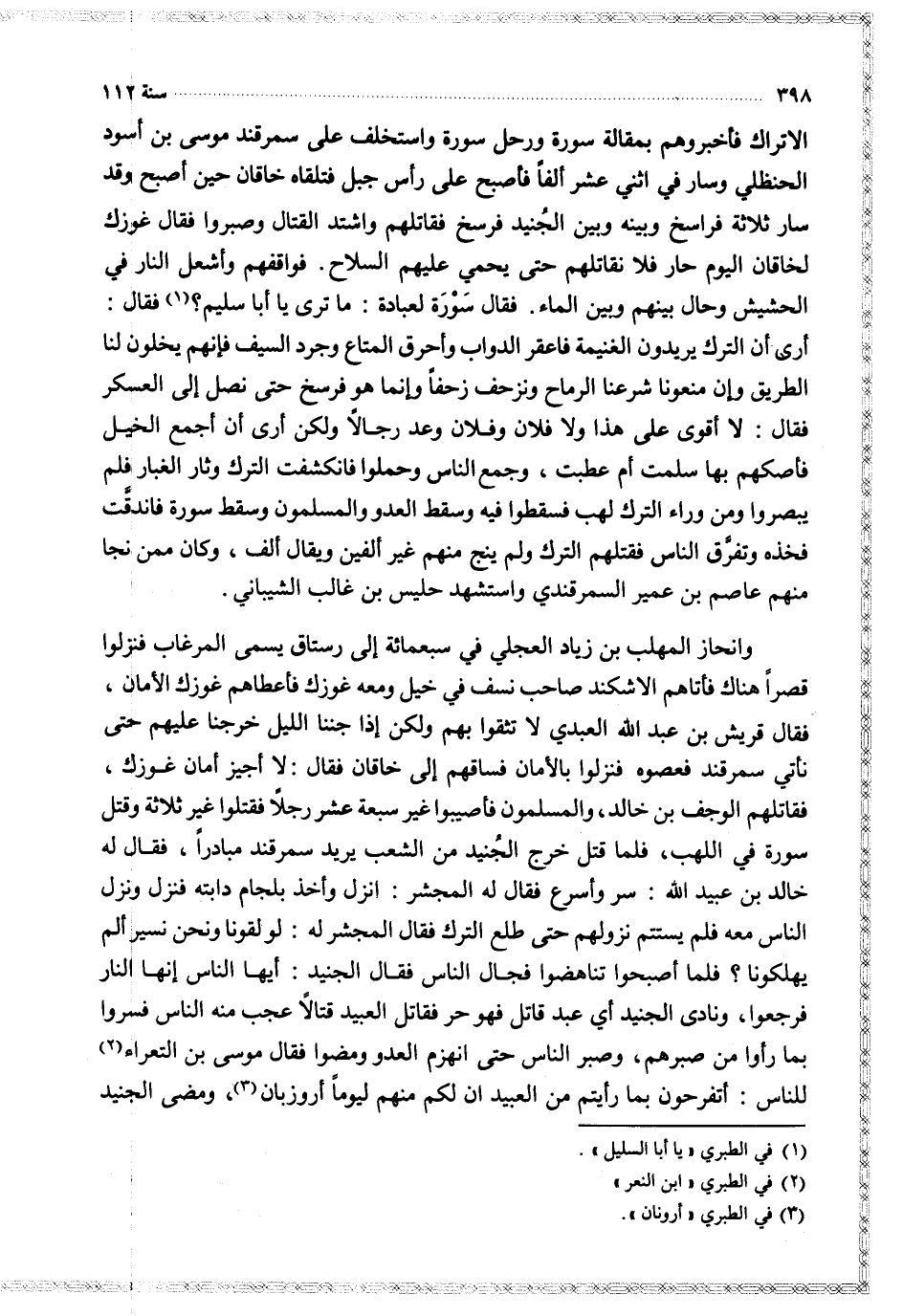 الاتراك فأخبروهم بمقالة سورة ورحل سورة واستخلف على سمرقند موسى بن أسود الحنظلي وسار في اثني عشر ألفا فأصبح على رأس جبل فتلقاه خاقان حين أصبح وقد سار ثلاثة فراسخ وبينه وبين الجنيد فرسخ فقاتلهم واشتد القتال وصبروا فقال غوزك لخاقان اليوم حار فلا نقاتلهم حتى يحمي عليهم السلاح فواقفهم وأشعل النار في الحشيش وحال بينهم وبين الماء فقال سورة لعبادة ما ترى يا أبا سليم فقال أرى أن الترك يريدون الغنيمة فاعقر الدواب وأحرق المتاع وجرد السيف فإنهم يخلون لنا الطريق وإن منعونا شرعنا الرماح ونزحف زحفا وإنما هو فرسخ حتى نصل إلى العسكر فقال لا أقوى على هذا ولا فلان وفلان وعد رجالا ولكن أرى أن أجمع الخيل فأصكهم بها سلمت أم عطبت وجمع الناس وحملوا فانكشفت الترك وثار الغبار فلم يبصروا ومن وراء الترك لهب فسقطوا فيه وسقط العدو والمسلمون وسقط سورة فاندقت فخذه وتفرق الناس فقتلهم الترك ولم ينج منهم غير ألفين ويقال ألف وكان ممن نجا منهم عاصم بن عمير السمرقندي واستشهد حليس بن غالب الشيباني