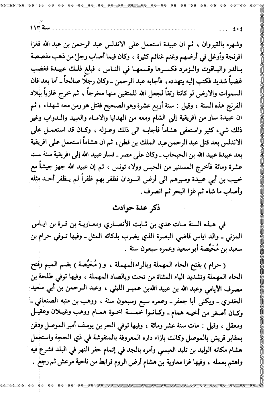 حرام بفتح الحاء المهملة وبالراء المهملة ومحيصة بضم الميم وفتح الحاء المهلملة وتشديد الياء المثناة من تحت وبالصاد المهملة وفيها توفي طلحة بن مصرف الأيامي وعبد الله بن عبيد الله بن عمير الليثي وعبد الرحمن بن أبي سعيد الخدري ويكنى أبا جعفر وعمره سبع وسبعون سنة ووهب بن منبه الصنعاني وكان أصغر من أخيه همام وكانوا خمسة اخوة همام ووهب وغيلان وعقيل ومعقل وقيل مات سنة عشر ومائة وفيها توفي الحر بن يوسف أمير الموصل ودفن بمقابر قريش بالموصل وكانت بازاء داره المعروفة بالمنقوشة في ذي الحجة واستعمل هشام مكانه الوليد بن تليد العبسي وأمره بالجد في إتمام حفر النهر في البلد فشرع فيه واهتم بعمله وفيها غزا معاوية بن هشام أرض الروم فرابط من ناحية مرعش ثم رجع