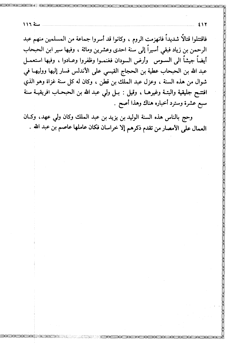 فاقتتلوا قتالا شديدا فانهزمت الروم وكانوا قد أسروا جماعة من المسلمين منهم عبد الرحمن بن زياد فبقي أسيرا إلى سنة إحدى وعشرين ومائة وفيها سير ابن الحبحاب أيضا جيشا إلى السوس وأرض السودان فغنموا وظفروا وعادوا وفيها استعمل عبد الله بن الحبحاب عطية بن الحجاج القيسي على الأندلس فسار إليها ووليها في شوال من هذه السنة وعزل عبد الملك بن قطن وكان له كل سنة غزاة وهو الذي افتتتح جليقية والبتة وغيرها وقيل بل ولي عبد الله بن الحبحاب افريقية سنة سبع عشرة وسترد أخباره هناك وهذا أصح