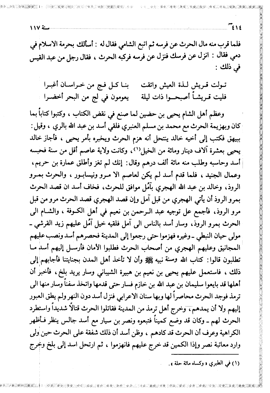 وعظم أهل الشام يحيى بن حضين لما صنع في نقض الكتاب وكتبوا كتابا بما كان وبهزيمة الحرث مع محمد بن مسلم العنبري فلقي أسد بن عبد الله بالري وقيل ببيهق فكتب إلى أخيه خالد ينتحل أنه هزم الحرث ويخبره بأمر يحيى فأجاز خالد يحيى بعشرة آلاف دينار ومائة من الخيل وكانت ولاية عاصم أقل من سنة فحبسه أسد وحاسبه وطلب منه مائة ألف درهم وقال إنك لم تغز وأطلق عمارة بن حبيب وعمال الجنيد فلما قدم أسد لم يكن لعاصم إلا مرو ونيسابور والحرث بمرو الروذ وخالد بن عبد الله الهجري بآمل موافق للحرث فخاف أسد ان قصد الحرث بمرو الروذ أن يأتي الهجر من قبل آمل وإن قصد الهجري قصد الحرث مرو من قبل مرو الروذ فأجمع على توجيه عبد الرحمن بن نعيم في أهل الكوفة والشام إلى الحرث بمرو الروذ وسار أسد بالناس إلى آمل فلقيه خيل آمل عليهم زيد القرشي مولى حيان النبطي وغيره فهزموا حتى رجعوا إلى المدينة فحصرهم أسد ونصب عليهم المجانيق وعليهم الهجري من أصحاب الحرث فطلبوا الأمان فأرسل إليهم أسد ما تطلبون قالوا كتاب الله وسنة نبيه وأن لا تأخذ أهل المدن بجنايتنا فأجابهم إلى ذلك فاستعمل عليهم يحيى بن نعيم بن هبيرة الشيباني وسار يريد بلخ فأخبر أن أهلها قد بايعوا سليمان بن عبد الله بن خازم فسار حتى قدمها واتخذ سفنا وسار منها إلى ترمذ فوجد الحرث محاصرا لها وبها سنان الأعرابي فنزل أسد دون النهر ولم يطق العبور إليهم ولا أن يمدهم وخرج أهل ترمذ من المدينة فقاتلوا الحرث قتالا شديدا واستطرد الحرث لهم وكان قد وضع كمينا فتبعوه ونصر بن سيار مع أسد جالس ينظر فأظهر الكراهية وعرف أن الحرث قد كادهم وظن أسد أن ذلك شفقة على الحرث حين ولى واراد معاتبة نصر وإذا الكمين قد خرج عليهم فانهزموا ثم ارتحل اسد إلى بلخ وخرج