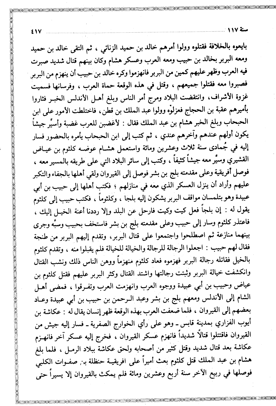 بايعوه بالخلافة فقتلوه وولوا أمرهم خالد بن حميد الزناتي ثم التقى خالد بن حميد ومعه البربر بخالد بن حبيب ومعه العرب وعسكر هشام وكان بينهم قتال شديد صبرت فيه العرب وظهر عليهم كمين من البربر فانهزموا وكره خالج بن حبيب أن ينهزم من البربر فصبروا معه فقتلوا جميعهم وقبل في هذه الوقعة حماة العرب وفرسانها فسميت غزوة الأشراف وانتقضت البلاد ومرج أمر الناس وبلغ أهل الأندلس الخبر فثاروا بأميرهم عقبة بن الحجاج فعزلوه وولوا عبد الملك بن قطن فاختلطت الأمور على ابن الحبحاب وبلغ الخبر هشام بن عبد الملك فقال لأغضبن للعرب غضبة وأسير جيشا يكون أولهم عندهم وآخرهم عندي ثم كتب إلى ابن الحبحاب يأمره بالحضور فسار إليه في جمادى سنة ثلاث وعشرين ومائة واستعمل هشام عوضه كلثوم بن عياض القشيري وسير معه جيشا كثيفا وكتب إلى سائر البلاد التي على طريقه بالمسير معه فوصل افريقية وعلى مقدمته بلج بن بشر فوصل إلى القيروان ولقي أهلها بالجفاء والتكبر عليهم وأراد أن ينزل العسكر الذي معه في منازلهم فكتب أهلها إلى حبيب بن ابي عبيدة وهو بتلمسان مواقف البربر يشكون إليه بلجا وكلثوما فكتب حبيب إلى كلثوم يقول له إن بلجا فقل كيت وكيت فارحل عن البلد وإلا رددنا أعنة الخيل إليك فاعتذر كلثوم وسار إلى حبيب وعلى مقدمته بلج بن بشر فاستخف بحبيب وسبه وجرى بينهما منازعة ثم اصطلحوا واجتمعوا على قتال البربر وتقدم إليهم البربر من طنجة فقال لهم حبيب اجعلوا الرجالة للرجالة والخيالة للخيالة فلم يقبلوا منه وتقدم كلثوم بالخيل فقاتله رجالة البربر فهزموه فعاد كلثوم منهزما ووهن الناس ذلك ونشب القتال وانكشفت خيالة البربر وثبتت رجالتها واشتد القتال وكثر البربر عليهم فقتل كلثوم بن عياض وحبيب بن أبي عبيدة ووجوه العرب وانهزمت العرب وتفرقوا فمضى أهل الشام إلى الأندلس ومعهم بلج بن بشر وعبد الرحمن بن حبيب بن أبي عبيدة وعاد بعضهم إلى القيروان فلما ضعفت العرب بهذه الوقعة ظهر إنسان يقال له عكاشة بن أيوب الفزاري بمدينة قابس وهو على رأي الخوارج الصفرية فسار إليه جيش من القيروان فاقتتلوا قتالا شديدا فانهزم عسكر القيروان فخرج إليه عسكر آخر فانهزم عكاشة بعد قتال شديد وقتل كثير من أصحابه ولحق عكاشة ببلاد الرمل فلما بلغ هشام بن عبد الملك قتل كلثوم بعث أميرا على افريقية حنظلة بن صفوات الكلبي فوصلها في ربيع الآخر سنة أربع وعشرين ومائة فلم يمكث بالقيروان إلا يسيرا حتى