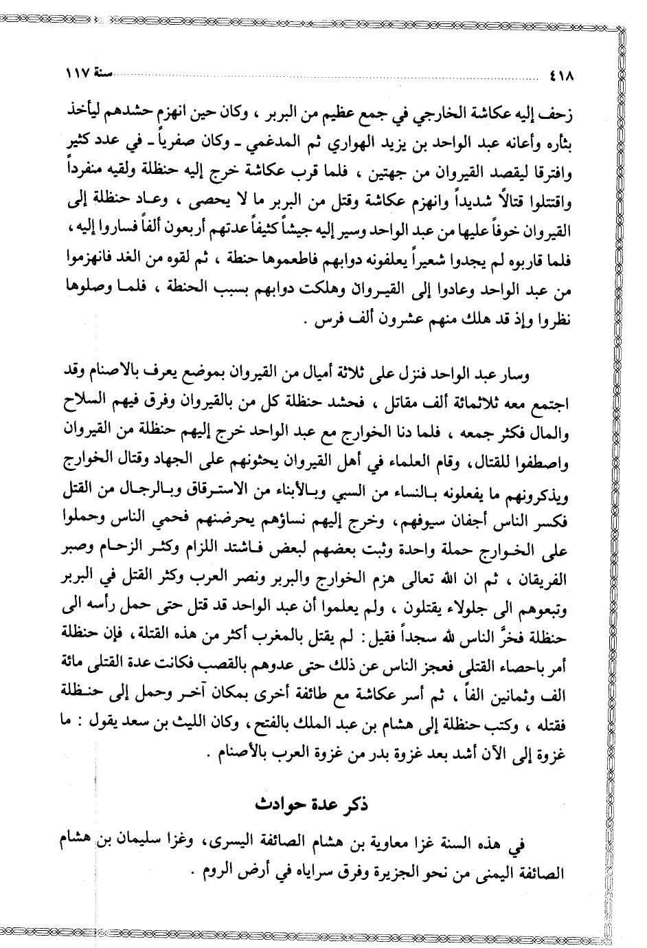 وسار عبد الواحد فنزل على ثلاثة أميال من القيروان بموضع يعرف بالاصنام وقد اجتمع معه ثلاثمائة ألف مقاتل فحشد حنظلة كل من بالقيروان وفرق فيهم السلاح والمال فكثر جمعه فلما دنا الخوارج مع عبد الواحد خرج إليهم حنظلة من القيروان واصطفوا للقتال وقام العلماء في أهل القيروان يحثونهم على الجهاد وقتال الخوارج ويذكرونهم ما يفعلونه بالنساء من السبي وبالأبناء من الاسترقاق وبالرجال من القتل فكسر الناس أجفان سيوفهم وخرج إليهم نساؤهم يحرضنهم فحمي الناس وحملوا على الخوارج حملة واحدة وثبت بعضهم لبعض فاشتد اللزام وكثر الزحام وصبر الفريقان ثم ان الله تعالى هزم الخوارج والبربر ونصر العرب وكثر القتل في البربر وتبعوهم إلى جلولاء يقتلون ولم يعلموا أن عبد الواحد قد قتل حتى حمل رأسه إلى حنظلة فخر الناس لله سجدا فقيل لم يقتل بالمغرب أكثر من هذه القتلة فأن حنظلة أمر باحصاء القتلى فعجز الناس عن ذلك حتى عدوهم بالقصب فكانت عدة القتلى مائة ألف وثمانين الفا ثم أسر عكاشة مع طائفة أخرى بمكان آخر وحمل إلى حنظلة فقتله وكتب حنظلة إلى هشام بن عبد الملك بالفتح وكان الليث بن سعد يقول ما غزوة إلى الآن أشد بعد غزوة بدر من غزوة العرب بالأصنام