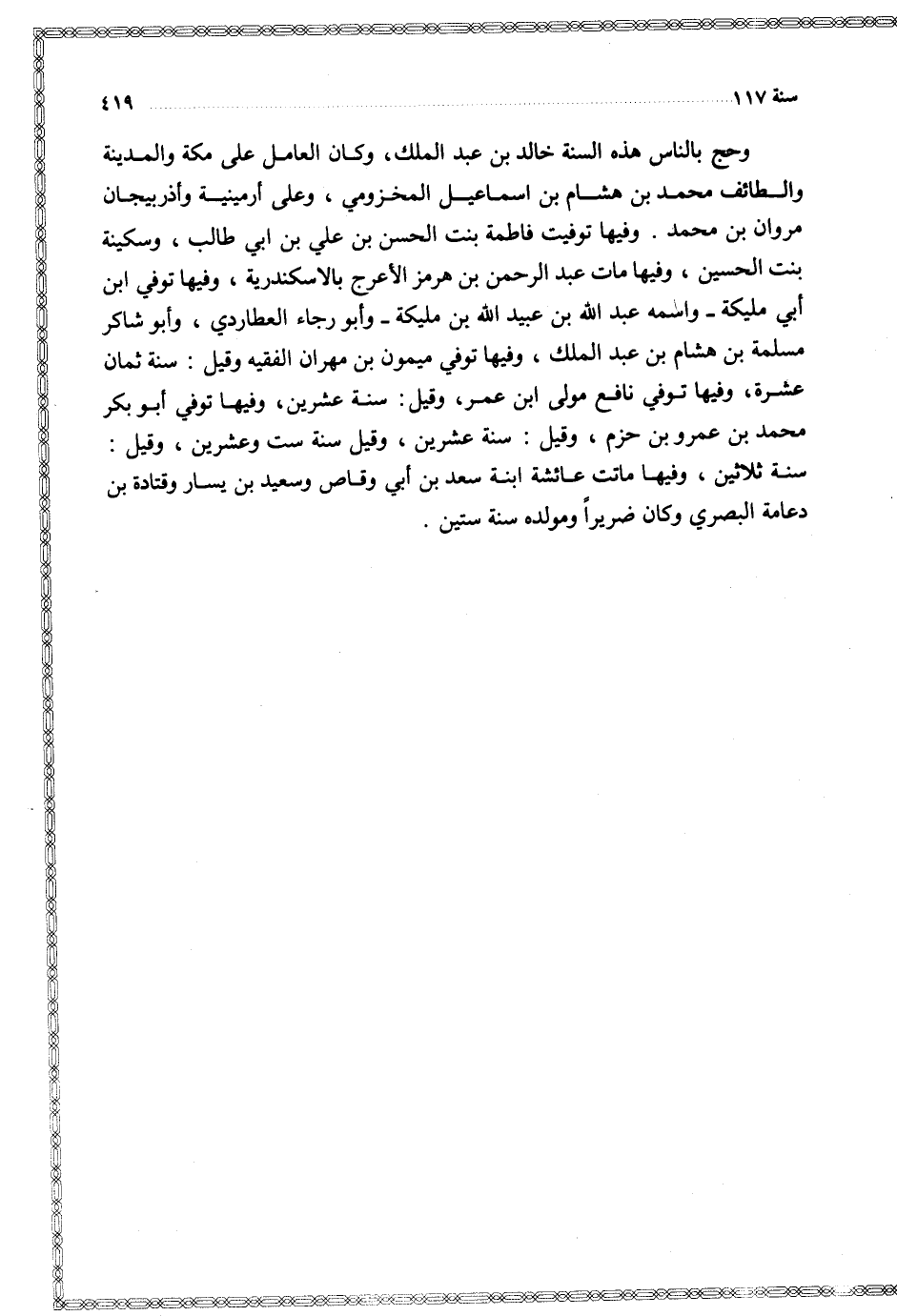 وحج بالناس هذه السنة خالد بن عبد الملك وكان العامل على مكة والمدينة والطائف محمد بن هشام بن اسماعيل المخزومي وعلى أرمينية وأذربيجان مروان بن محمد وفيها توفيت فاطمة بنت الحسن بن علي بن ابي طالب وسكينة بنت الحسين وفيها مات عبد الرحمن بن هرمز الأعرج بالاسكندرية وفيها توفي ابن ابي مليكة واسمه عبد الله بن عبيد الله بن مليكة وأبو رجاء العطاردي وأبو شاكر مسلمة بن هشام بن عبد الملك وفيها توفي ميمون بن مهران الفقيه وقيل سنة ثمان عشرة وفيها توفي نافع مولى ابن عمر وقيل سنة عشرين وفيها توفي أبو بكر محمد بن عمرو بن حزم وقيل سنة عشرين وقيل سنة ست وعشرين وقيل سنة ثلاثين وفيها ماتت عائشة ابنة سعد بن أبي وقاص وسعيد بن يسار وقتادة بن دعامة البصري وكان ضريرا ومولده سنة ستين