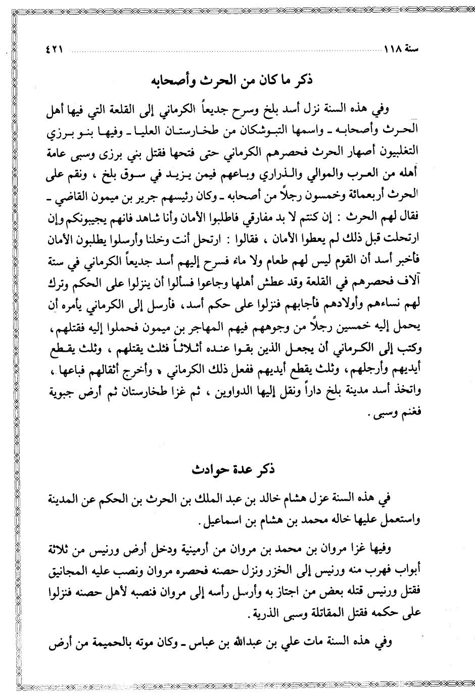 وفي هذه السنة نزل أسد بلخ وسرح جديعا الكرماني إلى القلعة التي فيها أهل الحرث وأصحابه واسمها التبوشكان من طخارستان العليا وفيها بنو برزي التغلبيون أصهار الحرث فحصرهم الكرماني حتى فتحها فقتل بني برزى وسبى عامة أهله من العرب والموالي والذراري وباعهم فيمن بزيد في سوق بلخ ونقم على الحرث أربعمائة وخمسون رجلا من أصحابه وكان رئيسهم جرير بن ميمون القاضي فقال لهم الحرث إن كنتم لا بد مفارقي فاطلبوا الأمان وأنا شاهد فانهم يجيبونكم وإن ارتحلت قبل ذلك لم يعطوا الأمان فقالوا ارتحل أنت وخلنا وأرسلوا يطلبون الأمان فأخبر أسد أن القوم ليس لهم طعام ولا ماء فسرح إليهم أسد جديعا الكرماني في ستة آلاف فحصرهم في القلعة وقد عطش أهلها وجاعوا فسألوا أن ينزلوا على الحكم وترك لهم نساءهم وأولادهم فأجابهم فنزلوا على حكم أسد فأرسل إلى الكرماني يأمره أن يحمل إليه خمسين رجلا من وجوههم فيهم المهاجر بن ميمون فحملوا إليه فقتلهم وكتب إلى الكرماني أن يجعل الذين بقوا عنده أثلاثا فثلث يقتلهم وثلث يقطع أيديهم وأرجلهم وثلث يقطع أيديهم ففعل ذلك الكرماني وأخرج أثقالهم فباعها واتخذ أسد مدينة بلخ دارا ونقل إليها الدواوين ثم غزا طخارستان ثم أرض جبوية فغنم وسبى