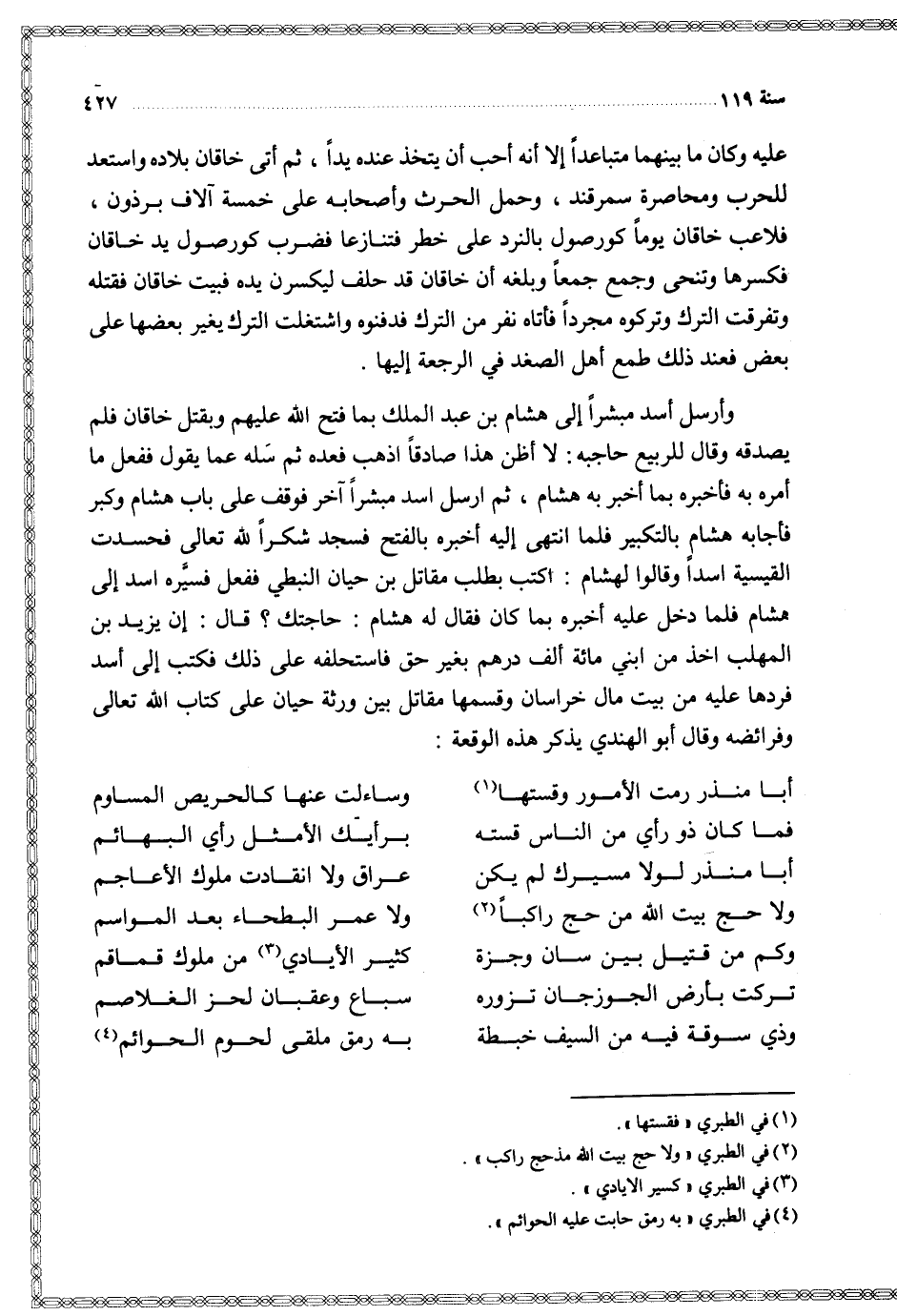 وأرسل أسد مبشرا إلى هشام بن عبد الملك بما فتح الله عليهم وبقتل خاقان فلم يصدقه وقال للربيع حاجبه لا أظن هذا صادقا اذهب فعده ثم سله عما يقول ففعل ما أمره به فأخبره به هشام ثم أرسل أسد مبشرا آخر فوقف على باب هشام وكبر فأجابه هشام بالتكبير فلما انتهى إليه أخبره بالفتح فسجد شكرا لله تعالى فحسدت القيسية أسدا وقالوا لهشام اكتب بطلب مقاتل بن حيان النبطي ففعل فسيره أسد إلى هشام فلما دخل عليه أخبره لما كان فقال له هشام حاجتك قال إن يزيد بن المهلب اخذ من ابني مائة ألف درهم بغير حق فاستحلفه على ذلك فكبت إلى أسد فردها عليه من بيت مال خراسان وقسمها مقاتل بين ورثة حيان على كتاب الله تعالى وفرائضه وقال أبو الهندي يذكر هذه الوقعة
