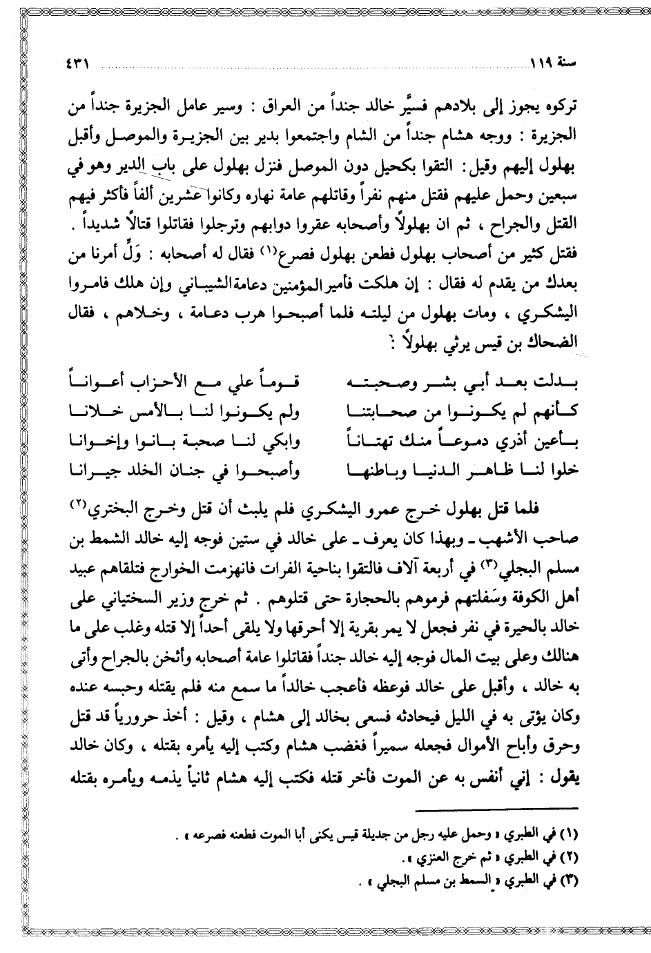 تركوه يجوز إلى بلادهم فسير خالد جندا من العراق وسير عامل الجزيرة جندا من الجزيرة ووجه هشام جندا من الشام واجتمعوا بدير بين الجزيرة والموصل وأقبل بهلول إليهم وقيل التقوا بكحيل دون الموصل فنزل بهلول على باب الدير وهو في سبعين وحمل عليهم فقتل منهم نفرا وقاتلهم عامة نهاره وكانوا عشرين ألفا فأكثر فيهم القتل والجراح ثم ان بهلولا وأصحابه عقروا دوابهم وترجلوا فقاتلوا قتالا شديدا فقتل كثير من أصحاب بهلول فطعن بهلول فصرع فقال له أصحابه ول أمرنا من بعدك من يقدم له فقال إن هلكت فأمير المؤمنين دعامة الشيباني وإن هلك فأمروا اليشكري ومات بهلول من ليلته فلما أصبحوا هرب دعامة وخلاهم فقال الضحاك بن قيس يرثي بهلولا