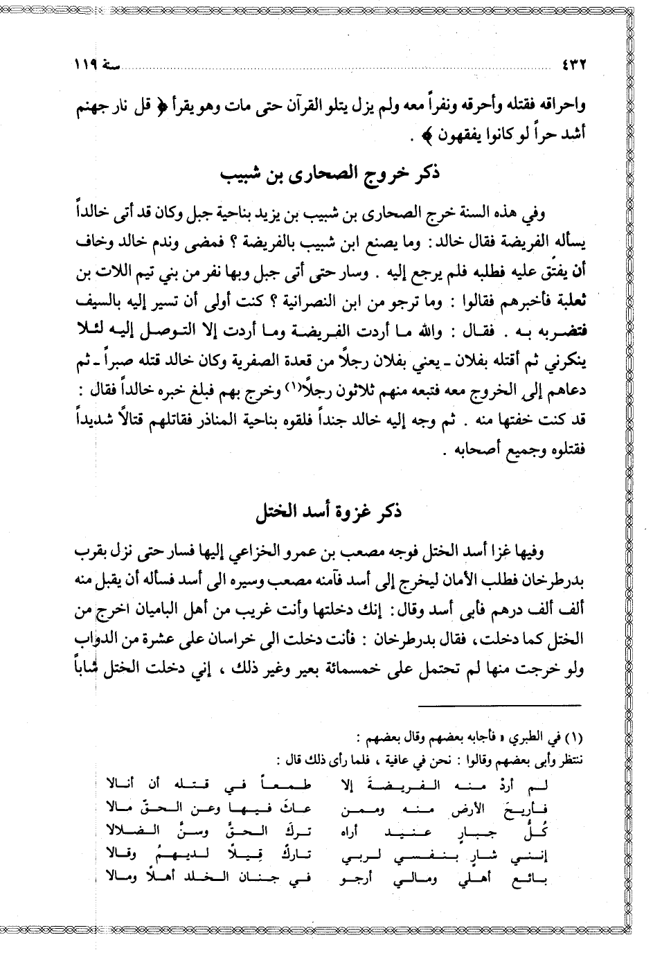 وفي هذه السنة خرج الصحارى بن شبيب بن يزيد بناحية جبل وكان قد أتى خالدا يسأله الفريضة فقال خالد وما يصنع ابن شبيب بالفريضة فمضى وندم خالد وخاف أن يفتق عليه فطلبه فلم يرجع إليه وسار حتى أتى جبل وبها نفر من بني تيم اللات بن ثعلبة فأخبرهم فقالوا وما ترجو من ابن النصرانية كنت أولى أن تسير إليه بالسيف فتضربه به فقال والله ما أردت الفريضة وما أردت إلا التوصل إليه لئلا ينكرني ثم أقتله بفلان يعني بفلان رجلا من قعدة الصفرية وكان خالد قتله صبرا ثم دعاهم إلى الخروج معه فتبعه منهم ثلاثون رجلا وخرج بهم فبلغ خبره خالدا فقال قد كنت خفتها منه ثم وجه إليه خالد جندا فلقوه بناحية المناذر فقاتلهم قتالا شديدا فقتلوه وجميع أصحابه