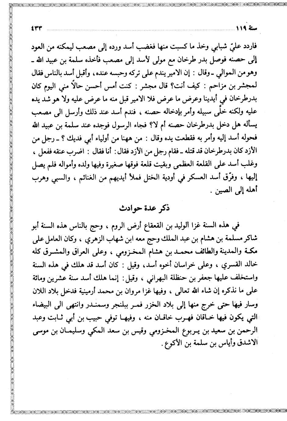في هذه السنة غزا الوليد بن القعقاع أرض الروم وحج بالناس هذه السنة أبو شاكر مسلمة بن هشام بن عبد الملك وحج معه ابن شهاب الزهري وكان العامل على مكة والمدينة والطائف محمد بن هشام المخزومي وعلى العراق والمشرق كله خالد القسري وعلى خراسان أخوه أسد وقيل كان أسد قد هلك في هذه السنة واستخلف عليها جعفر بن حنظلة البهراني وقيل إنما هلك أسد سنة عشرين ومائة على ما نذكره إن شاء الله تعالى وفيها غزا مروان بن محمد أرمينية فدخل بلاد اللان وسار فيها حتى خرج منها إلى بلاد الخزر فمر ببلنجر وسمندر وانتهى إلى البيضاء التي يكون فيها خاقان فهرب خاقان منه وفيها توفي حبيب بن أبي ثابت وعبد الرحمن بن سعيد بن يربوع المخزومي وقيس بن سعد المكي وسليمان بن موسى الاشدق وأياس بن سلمة بن الأكوع