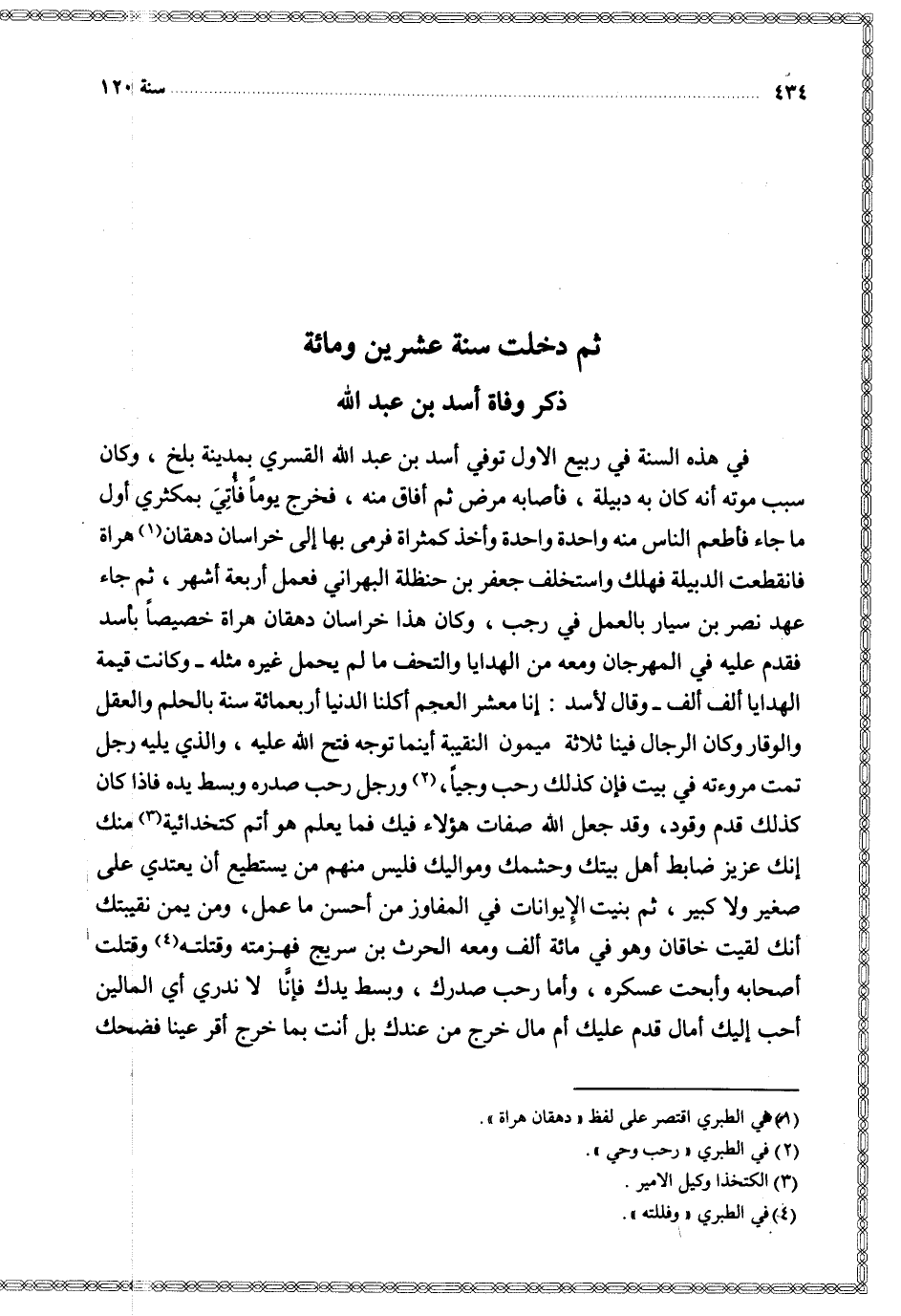 في هذه السنة في ربيع الأول توفي أسد بن عبد الله القسري بمدينة بلخ وكان سبب موته أنه كان به دبيلة فأصابه مرض قم أفاق منه فخرج يوما فأتي بمكثري أول ما جاء فأطعم الناس منه واحدة واحدة وأخذ كمثراة فرمى بها إلى خراسان دهقان هراة فانقطعت الدبيلة فهلك واستخلف جعفر بن حنظلة البهراني فعمل أربعة أشهر ثم جاء عهد نصر بن سيار بالعمل في رجب وكان هذا خراسان دهقان هراة خصيصا بأسد فقدم عليه في المهرجان ومعه من الهدايا والتحف ما لم يحمل غيره مثله وكانت قيمة الهدايا ألف ألف وقال لأسد إنا معشر العجم أكلنا الدنيا أربعمائة سنة بالحلم والعقل والوقار وكان الرجال فينا ثلاثة ميمون النقيبة أينما توجه فتح الله عليه والذي يليه رجل تمت مروءته في بيت فإن كذلك رحب وجيا ورجل رحب صدره وبسط يده فإذا كان كذلك قدم وقود وقد جعل الله صفات هؤلاء فيك فما يعلم هو أم كتخدائية منك إنك عزيز ضابط أهل بيتك وحشمك ومواليك فليس منهم من يستطيع أن يعتدي على صغير ولا كبير ثم بنيت الإيوانات في المفاوز من أحسن ما عمل ومن يمن نقيبتك أنك لقيت خاقان وهو في مائة ألف ومعه الحرث بن سريج فهزمته وقتلته وقتلت أصحابه وأبحت عسكره وأما رحب صدرك وبسط يدك فإنا لا ندري أي المالين أحب إليك أمال قدم عليك أم مال خرج من عندك بل أنت بما خرج أقر عينا فضحك