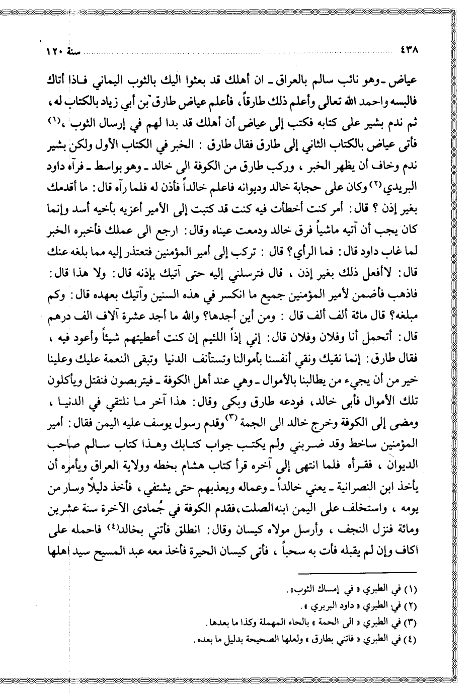 عياض وهو نائب سالم بالعراق ان أهلك قد بعثوا إليك بالثوب اليماني فإذا أتاك فالبسه واحمد الله تعالى وأعلم ذلك طارقا فأعلم عياض طارق بن أبي زياد بالكتاب له ثم ندم بشير على كتابه فكتب إلى عياض أن أهلك قد بدا لهم في إرسال الثوب فأتى عياض بالكتاب الثاني إلى طارق فقال طارق الخبر في الكتاب الأول ولكن بشير ندم وخاف أن يظهر الخبر وركب طارق من الكوفة إلى خالد وهو بواسط فرآه داود البريدي وكان على حجابة خالد وديوانه فاعلم خالدا فأذن له فلما رآه قال ما أقدمك بغير إن قال أمر كنت أخطأت فيه كنت قد كتبت إلى الأمير أعزيه بأخيه أسد وانما كان يجب أن آتيه ماشيا فرق خالد ودمعت عيناه وقال ارجع إلى عملك فأخبره الخبر لما غاب داود قال فما الرأي قال تركب إلى أمير المؤمنين فتعتذر إليه مما بلغه عنك قال لا أفعل ذلك بغير إذن قال فترسلني إليه حتى آتيك بإذنه قال ولا هذا قال فاذهب فأضمن لأمير المؤمنين جميع ما انكسر في هذه السنين وآتيك بعهده قال وكم مبلغه قال مائة ألف ألف قال ومن أين أجدها والله ما أجد عشرة آلاف الف درهم قال أتحمل أنا وفلان وفلان قال إني إذا اللئيم إن كنت أعطيتهم شيئا وأعود فيه فقال طارق إنما نقيك ونقي أنفسنا بأموالنا ونستأنف الدنيا وتبقى النعمة عليك وعلينا خير من أن يجيء من يطالبنا بالأموال وهي عند أهل الكوفة فيتربصون فنقتل ويأكلون تلك الأموال فأبى خالد فودعه طارق وبكى وقال هذا آخر ما نلتقي في الدنيا ومضى إلى الكوفة وخرج خالد إلى الجمة وقدم رسول يوسف عليه اليمن فقال أمير المؤمنين ساخط وقد ضربني ولم يكتب جواب كتابك وهذا كتاب سالم صاحب الديوان فقرأه فلما انتهى إلى أخره قرأ كتاب هشام بخطه وولاية العراق يأمره أن يأخذ ابن النصرانية يعني خالدا وعماله ويعذبهم حتى يشتفي فأخذ دليلا وسار من يومه واستخلف على اليمن ابنه الصلت فقدم الكوفة في جمادى الآخر سنة عشرين ومائة فنزل النجف وأرسل مولاه كيسان وقال أنطلق فأتني بخالد فاحمله على اكاف وان لم يقبله فأت به سحبا فأتى كيسان الحيرة فأخذ معه عبد المسيح سيد أهلها