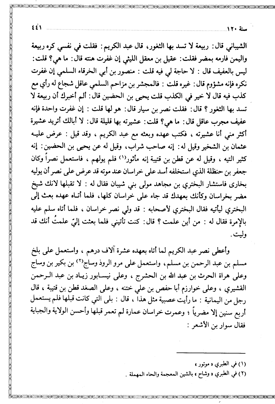 الشيباني قال ربيعة لا تسد بها الثغور قال عبد الكريم فقلت في نفسي كره ربيعة واليمن فارمه بمضر فقلت عقيل بن معقل الليثي إن غفرت هنته قال ما هي قلت ليس بالعفيف قال لا حاجة لي فيه قلت منصور بن أبي الخرقاء السلمي إن غفرت نكره فإنه مشؤوم قال غيره قلت فالمجشر بن مزاحم السلمي عاقل شجاع له رأي مع كذب فيه قال لا خير في الكذب قلت يحيى بن الحضين قال ألم أخبرك أن ربيعة لا تسد بها الثغور قال فقلت نصر بن سيار قال هو لها قلت إن غفرت واحدة فإنه عفيف مجرب عاقل قال ما هي قلت عشيرته بها قليلة قال لا أبالك أتريد عشيرة أكثر مني أنا عشيرته فكتب عهده وبعثه مع عبد الكريم وقد قيل عرض عليه عثمان بن الشخير وقيل له إنه صاحب شراب وقيل له عن يحيى بن الحضين إنه كثير التيه وقيل له عن قطن بن قتيبة إنه مأثور فلم يولهم فاستعمل نصرا وكان جعفر بن حنظلة الذي استخلفه أسد على خراسان عند موته قد عرض على نصر أن يوليه بخارى فاستشار البختري بن مجاهد مولى بني شيبان فقال له لا تقبلها لانك شيخ مضر بخراسان وكأنك بعهدك قد جاء على خراسان كلها فلما أتاه عهده بعث إلى البختري ليأتيه فقال البختري لأصحابه قد ولي نصر خراسان فلما أتاه سلم عليه بالإمرة فقال له من أين علمت قال كنت تأتيني فلما بعثت إلي علمت أنك قد وليت