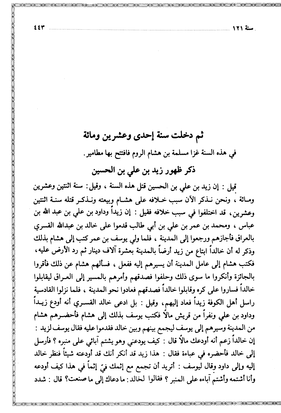 قيل إن زيد بن علي بن الحسين قتل هذه السنة وقيل سنة اثنتين وعشرين ومائة ونحن نذكر الآن سبب خلافه على هشام وبيعته ونذكر قتله سنة اثنتين وعشرين قد اختلفوا في سبب خلافه فقيل إن زيدا وداود بن علي بن عبد الله بن عباس ومحمد بن عمر بن علي بن أبي طالب قدموا على خالد بن عبد الله القسري بالعراق فأجازهم ورجعوا إلى المدينة فلما ولي يوسف بن عمر كتب إلى هشام بذلك وذكر له أن خالدا ابتاع من زيد أرضا بالمدينة بعشرة آلاف دينار ثم رد الأرض عليه فكتب هشام إلى عامل المدينة أن يسيرهم إليه ففعل فسألهم هشام عن ذلك فأقروا بالجائزة وأنكروا ما سوى ذلك وحلفوا فصدقهم وأمرهم بالمسير إلى العراق ليقابلوا خالدا فساروا على كره وقابلوا خالدا فصدقهم فعادوا نحو المدينة فلما نزلوا القادسية راسل أهل الكوفة زيدا فعاد إليهم وقيل بل أدعى خالد القسري أنه أودع زيدا وداود بن علي ونفرا من قريش مالا فكتب يوسف بذلك إلى هشام فأحضرهم هشام من المدينة وسيرهم إلى يوسف ليجمع بينهم وبين خالد فقدموا عليه فقال يوسف لزيد إن خالدا زعم أنه أودعك مالا قال كيف يودعني وهو يشتم آبائي على منبره فأرسل إلى خالد فأحضره في عباءة فقال هذا زيد قد أنكر أنك قد أودعته شيئا فنظر إليه خالد إليه وإلى داود وقال ليوسف أتريد أن تجمع مع إثمك في إثما في هذا كيف أودعه وأنا أشتمه وأشتم آباءه على المنبر فقالوا لخالد ما دعاك إلى ما صنعت قال شدد