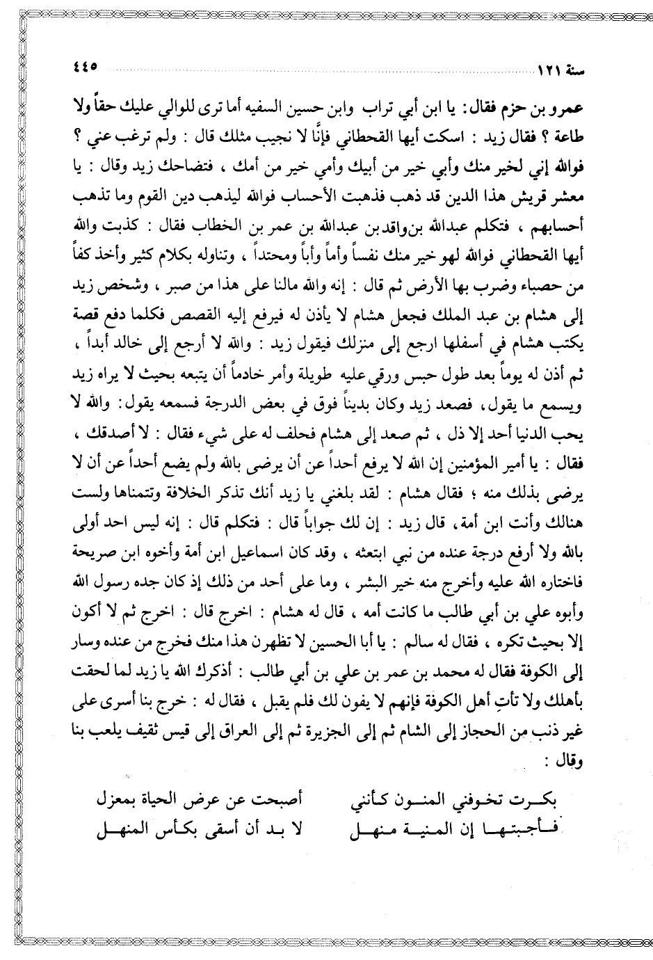 عمرو بن حزم فقال يا ابن أبي تراب وابن حسين السفيه أما ترى للوالي عليك حقا ولا طاعة فقال زيد اسكت أيها القحطاني فإنا لا نجيب مثلك قال ولم ترغب عني فوالله إني لخير منك وأبي خير من أبيك وأمي خير من أمك فتضاحك زيد وقال يا معشر قريش هذا الدين قد ذهب فذهب الأحساب فوالله ليذهب دين القوم وما تذهب أحسابهم فتكلم عبد الله بن واقد بن عبد الله بن عمر بن الخطاب فقال كذبت والله أيها القحطاني فوالله لهو خير منك نفسا وأما وأبا ومحتدا وتناوله بكلام كثير وأخذ كفا من حصباء وضرب بها الأرض ثم قال إنه والله مالنا على هذا من صبر وشخص زيد إلى هشام بن عبد الملك فجعل هشام لا يأذن له فيرفع إليه القصص فكلما دفع قصة يكتب هشام في أسفلها ارجع إلى منزلك فيقول زيد والله لا أرجع إلى خالد أبدا ثم أذن له يوما بعد طول حبس ورقي عليه طويلة وأمر خادما أن يتبعه بحيث لا يراه زيد ويسمع ما يقول فصعد زيد وكان بدينا فوق بعض الدرجة فسمعه يقول والله لا يحب الدنيا أحد إلا ذل ثم صعد إلى هشام فحلف له على شيء فقال لا أصدقك فقال يا أمير المؤمنين إن الله لا يرفع أحدا عن أن يرضى بالله ولم يضع أحدا عن أن لا يرضى بذلك منه فقال هشام لقد بلغني يا زيد أنك تذكر الخلافة وتتمناها ولست هنالك وأنت ابن أمة قال زيد إن لك جوابا قال فتكلم قال إنه ليس احد أولى بالله ولا أرفع درجة عنده من نبي ابتعثه وقد كان اسماعبيل ابن أمة وأخوه ابن صريحة فاختاره الله عليه وأخرج منه خير البشر وما على أحد من ذلك إذ كان جدة رسول الله وأبوه علي بن أبي طالب ما كانت أمه قال له هشام اخرج قال أخرج ثم لا أكون إلا بحيث تكره فقال له سالم يا أبا الحسين لا تظهرن هذا منك فخرج من عنده وسار إلى الكوفة فقال له محمد بن عمر بن علي بن أبي طالب أذكرك الله يا زيد لما لحقت بأهلك ولا تأت أهل الكوفة فإنهم لا يفون لك فلم يقبل فقال له خرج بنا أسرى على غير ذنب من الحجاز إلى الشام ثم إلى الجزيرة ثم إلى العراق إلى قيس ثقيف يلعب بنا وقال