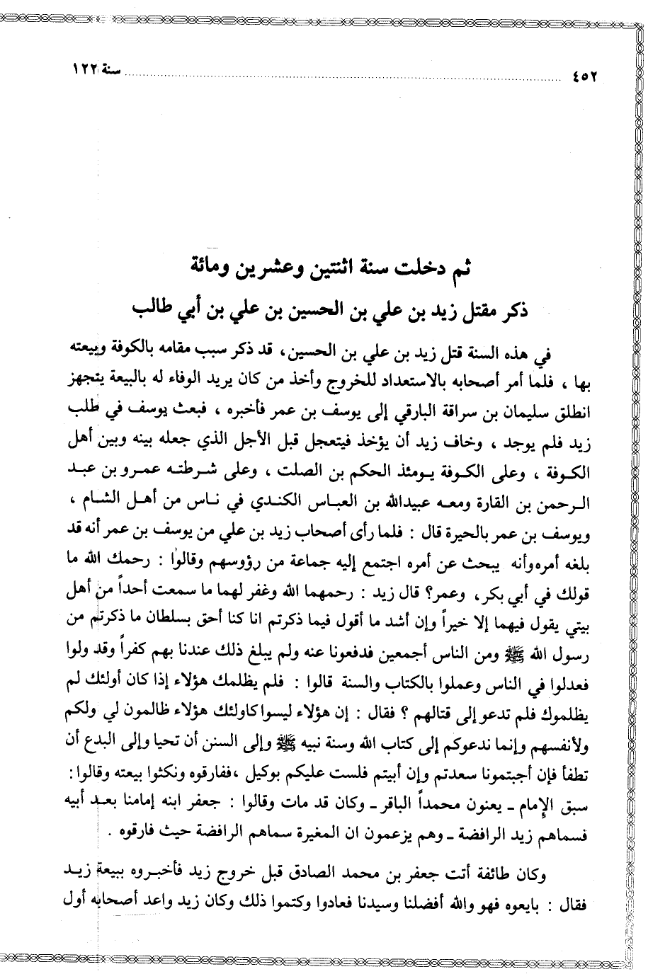 في هذه السنة قتل زيد بن علي بن الحسين قد ذكر سبب مقامه بالكوفة وبيعته بها فلما أمر أصحابه بالاستعداد للخروج وأخذ من كان بريد الوفاء له بالبيعة يتجهز انطلق سليمان بن سرقة البارقي إلى يوسف بن عمر فأخبره فبعث يوسف في طلب زيد فلم يوجد وخاف زيد أن يؤخذ فيتعجل قبل الأجل الذي جعله بينه وبين أهل الكوفة وعلى الكوفة يومئذ الحكم بن الصلت وعلى شرطته عمرو بن عبد الرحمن بن القارة ومعه عبيد الله بن العباس الكندي في ناس من أهل الشام ويوسف بن عمر بالحيرة قال فلما رأى أصحاب زيد بن علي من يوسف بن عمر أنه قد بلغه أمره وأنه يبحث عن أمره اجتمع إليه جماعة من رؤوسهم وقالوا رحمك الله ما قولك في أبي بكر وعمر قال زيد رحمهما الله وغفر لهما ما سمعت أحدا من أهل بيتي يقول فيهما إلا خيرا وإن أشد ما أقول فيما ذكرتم أنا كنا أحق بسلطان ما ذكرتم من رسول الله ومن الناس أجمعين فدفعونا عنه ولم يبلغ ذلك عندنا بهم كفرا وقد ولوا فعدلوا في الناس وعملوا بالكتاب والسنة قالوا فلم يظلمك هؤلاء إذا كان أولئك لم يظلموك فمل تدعو إلى قتالهم فقال إن هؤلاء ليسوا كاولئك هؤلاء ظالمون لي ولكم ولأنفسهم وإنما ندعوكم إلى كتاب الله وسنة نبيه والى السنن أن تحيا وإلى البدع أن تطفأ فإن أجبتمونا سعدتم وإن أبيتم فلست عليكم بوكيل ففارقوه ونكثوا ببيعته وقالوا سبق الإمام يعنون محمدا الباقر وكان قد مات وقالوا جعفر ابنه إمامنا بعد أبيه فسماهم زيد الرافضة وهم يزعمون ان المغيرة سماهم الرافضة حيث فارقوه