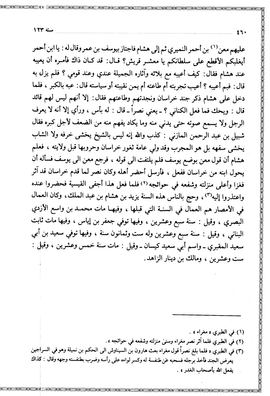 عليهم معن بن أحمر النميري ثم إلى هشام فاجتاز بيوسف بن عمر وقال له يا ابن أحمر أيغلبكم الأقطع على سلطانكم يا معشر قريش قال قد كان ذاك فأمره أن يعيبه عند هشام فقال كيف أعيبه مع بلائه وآثاره الجميلة عندي وعند قومي فلم يزل به قال فبم أعيبه أعيب تجربته أم طاعته أم يمن نفيبته أو سياسته قال عبه بالكبر فلما دخل على هشام ذكر جند خراسان ونجدتهم وطاعتهم فقال إلا أنهم ليس لهم قائد قال ويحك فما فعل الكناني يعني نصرا قال له بأس ورأي إلا أنه لا يعرف الرجل ولا يسمع صوته حتى يدني منه وما يكاد يفهم منه من الضعف لأجل كبره فقال شبيل بن عبد الرحمن المازني كذب والله إنه ليس بالشيخ يخشى خرفه ولا الشاب يخشى سفهه بل هو المجرب وقد ولي عامة ثغور خراسان وحروبها قبل ولايته فعلم هشام أن قول معن بوضع يوسف فلم يلتفت إلى قوله فرجع معن إلى يوسف فسأله أن يحول ابنه من خراسان ففعل فأرسل أحضر أهله وكان نصر لما قدم خراسان قد آثر فغزا وأعلى منزلته وشفعه في حوائجه فلما فعل هذا أجفى القيسية فحضروا عنده واعتذروا إليه وحج بالناس هذه السنة يزيد بن هشام بن عبد الملك وكان العمال في الأمصار هم العمال في السنة التي قبلها وفيها مات محمد بن واسع الأزدي البصري وقيل سنة سبع وعشرين وفيها توفي جعفر بن إياس وفيها مات ثابت البناني وقيل سنة سبع وعشرين وله ست وثمانون سنة وفيها توفي سعيد بن أبي سعيد المقبري واسم أبي سعيد كيسان وقيل مات سنة خمس وعشرين وقيل ست وعشرين ومالك بن دينار الزاهد