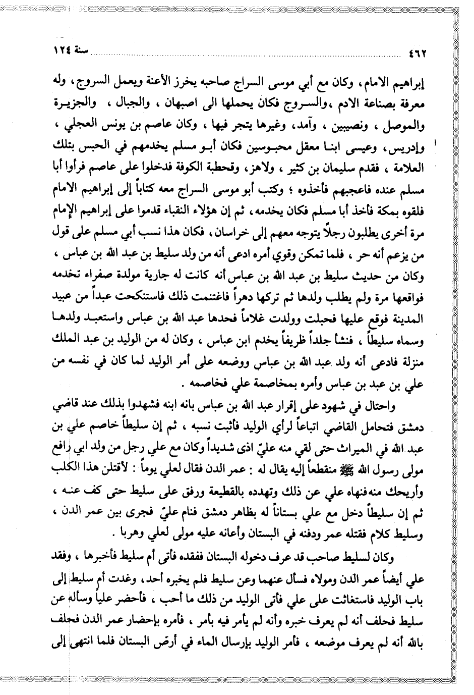 إبراهيم الامام وكان مع أبي موسى السراج صاحبه يخرز الأعنة ويعمل السروج وله معرفة بصناعة الادم والسروج فكان يحملها إلى اصبهان والجبال والجزيرة والموصل ونصيبين وآمد وغيرها يتجر فيها وكان عاصم بن يونس العجلي وإدريس وعيسى ابنا معقل محبوسين فكان أبو مسلم يخدمهم في الحبس بتلك العلامة فقدم سليمان بن كثير ولاهز وقحطبة الكوفة فدخلوا على عاصم فرأوا أبا مسلم عنده فاعجبهم فأخذوه وكتب أبو موسى السراج معه كتابا إلى إبراهيم الامام فلقوه بمكة فأخذ أبا مسلم فكان يخدمه ثم إن هؤلاء النقباء قدموا على إبراهيم الإمام مرة أخرى يطلبون رجلا يتوجه معهم إلى خراسان فكان هذا نسب أبي مسلم على قول من يزعم أنه حر فلما تمكن وقوي أمره ادعى أنه ولد سليط بن عبد الله بن عباس وكان من حديث سليط بن عبد الله بن عباس أنه كانت له جارية مولدة صفراء تخدمه فواقعها مرة ولم يطلب ولدها ثم تركها دهرا فاغتنمت ذلك فاستنكحت عبدا من عبيد المدينة فوقع عليها فحبلت وولدت غلاما فحدها عبد الله بن عباس واستعبد ولدها وسماه سليطا فنشأ جلدا ظريفا يخدم ابن عباس وكان له من الوليد بن عبد الملك منزلة فادعى أنه ولد عبد الله بن عباس ووضعه على أمر الوليد لما كان في نفسه من علي بن عبد بن عباس وأمره بمخاصمة علي فخاصمه