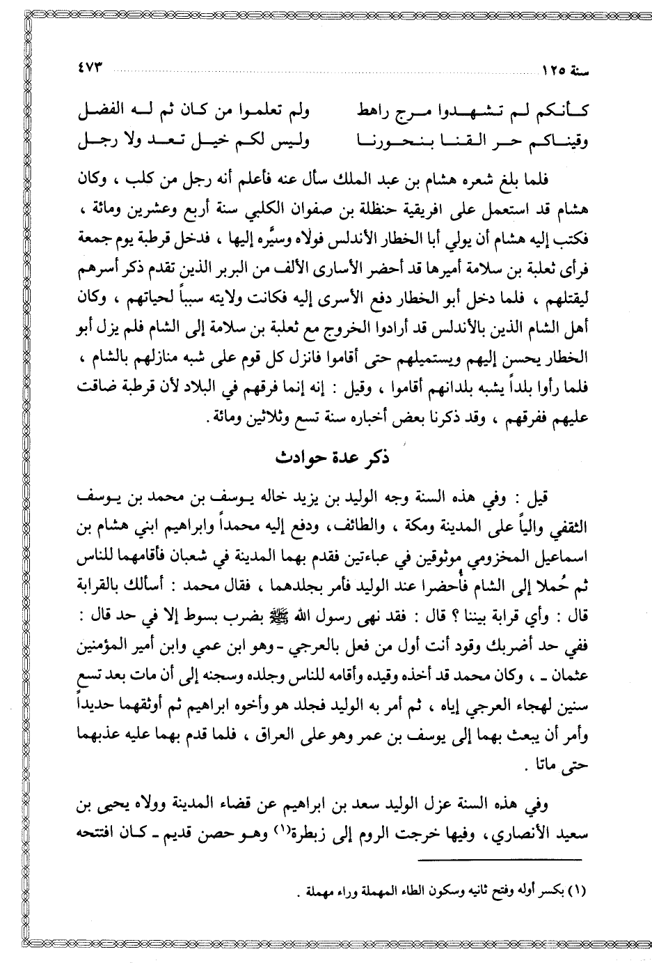 قيل وفي هذه السنة وجه الوليد بن يزيد خاله يوسف بن محمد بن يوسف الثقفي واليا على المدينة ومكة والطائف ودفع إليه محمدا وابراهيم ابني هشام بن اسماعيل المخزومي موثوقين في عباءتين فقدم بهما المدينة في شعبان فأقامهما للناس ثم حملا إلى الشام فأحضرا عند الوليد فأمر بجلدهما فقال محمد أسألك بالقرابة قال وأي قرابة بيننا قال فقد نهى رسول الله بضرب بسوط إلا في حد قال ففي حد أضربك وقود أنت أول من فعل بالعرجي وهو ابن عمي وابن أمير المؤمنين عثمان وكان محمد قد أخذه وقيده وأقامه للناس وجلده وسجنه إلى أن مات بعد تسع سنين لهجاء العرجي إياه ثم أمر به الوليد فجلد هو وأخوه ابراهيم ثم أوثقهما حديدا وأمر أن يبعث بهما إلى يوسف بن عمر وهو على العراق فلما قدم بهما عليه عذبهما حتى ماتا
