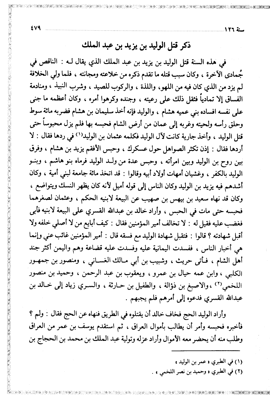 في هذه السنة قتل الوليد بن يزيد بن عبد الملك الذي يقال له الناقص في جمادى الآخرة وكان سبب قتله ما تقدم ذكره من خلاعته ومجانته فلما ولي الخلافة لم يزد من الذي كان فيه من اللهو واللذه والركوب للصيد وشرب النبيذ ومنادمة الفساق إلا تماديا فثقل ذلك على رعيته وجنده وكرهوا أمره وكان أعظمه ما جنى على نفسه افساده بني عميه هشام والوليد فإنه أخذ سلميان بن هشام فضربه مائة سوط وحلق رأسه ولحيته وغربه إلى عمان من أرض الشام فحبسه بها فلم يزل محبوسا حتى قتل الوليد وأخذ جارية كانت لآل الوليد فكلمه عثمان بن الوليد في ردها فقال لا أردها فقال إذن تكثر الصواهل حول عسكرك وحبس الأفقم يزيد بن هشام وفرق بين روح بن الوليد وبين امرأته وحبس عدة من ولد الوليد فرماه بنو هشام وبنو الوليد بالكفر وغشيان أمهات أولاد أبيه وقالوا قد اتخذ مائة جامعة لبني أمية وكان أشدهم فيه يزيد بن الوليد وكان الناس إلى قوله أميل لأنه كان يظهر النسك ويتواضع وكان قد نهاه سعيد بن بيهس به صهيب عن البيعة لابنيه الحكم وعثمان لصغرهما فحبسه حتى مات في الحبس وأراد خالد بن عبد الله القسري على البيعة لابنيه فأبى فغضب عليه فقيل له لا تخالف أمير المؤمنين فقال كيف أبايع من لا أصلي خلفه ولا أقبل شهادته قالوا فتقبل شهادة الوليد مع فسقة قال أمير المؤمنين غائب عني وإنما هي أخبار الناس ففسدت اليمانية عليه وفسدت عليه قضاعة وهم اليمن أكثر جند أهل الشام فأتى حريث وشبيب بن أبي مالك الغساني ومنصور بن جبور الكلبي وابن عمه حيال بن عمرو ويعقوب بن عبد الرحمن وحميد بن منصور اللخمي والاصبغ بن ذؤالة والطفيل بن حارثة والسري زياد إلى خالد بن عبد الله القسري فدعوه إلى أمرهم فلم يجبهم