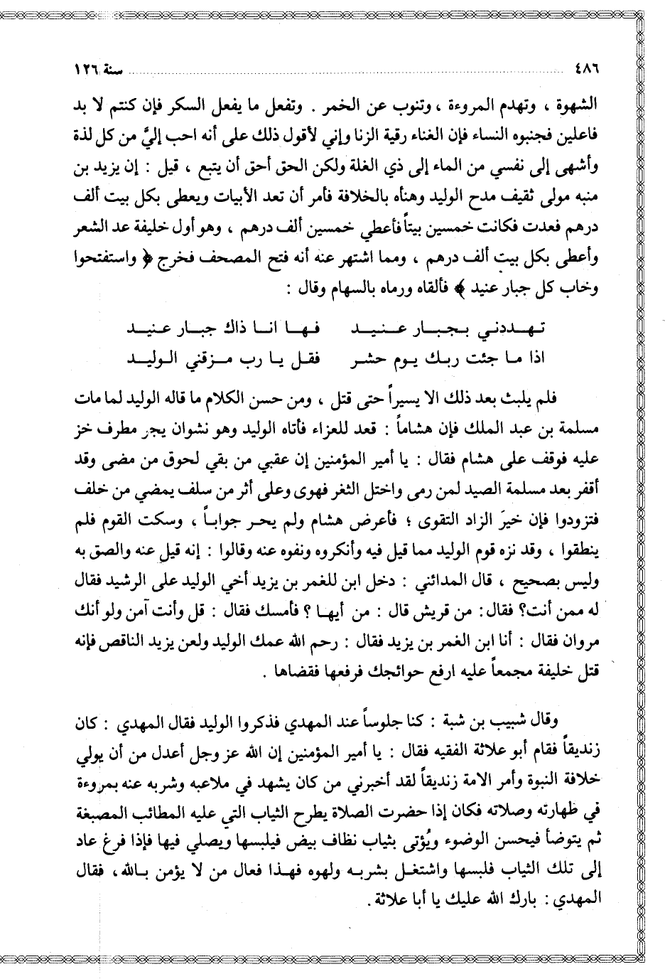 فلم يلبث بعد ذلك الا يسيرا حتى قتل ومن حسن الكلام ما قاله الوليد لما مات مسلمة بن عبد الملك فإن هشاما قعد للعزاء فأتاه الوليد وهو نشوان يجر مطرق خز عليه فوقف على هشام فقال يا أمير المؤمنين إن عقبي من بقي لحوق من مضى وقد أقفر بعد مسلمة الصيد لمن رمى واختل الثغر فهوى وعلى أثر من سلف يمضي من خلف فتزودوا فإن خير الزاد التقوى فأعرض هشاما ولم يحر جوابا وسكت القوم فلم ينطقوا وقد نزه قوم الوليد مما قيل فيه وأنكروه ونفوه عنه وقالوا إنه قيل عنه والصق به وليس بصحيح قال المدائني دخل ابن للغمر بن يزيد أخي الوليد على الرشيد فقال له ممن أنت فقال من قريش قال من أيها فأمسك فقال قل وأنت آمن ولو أنك مروان فقال أنا ابن الغمر بن يزيد فقال رحم الله عمك الوليد ولعن يزيد الناقص فإنه قتل خليفة مجمعا عليه ارفع حوائجك فرفعها فقضاها