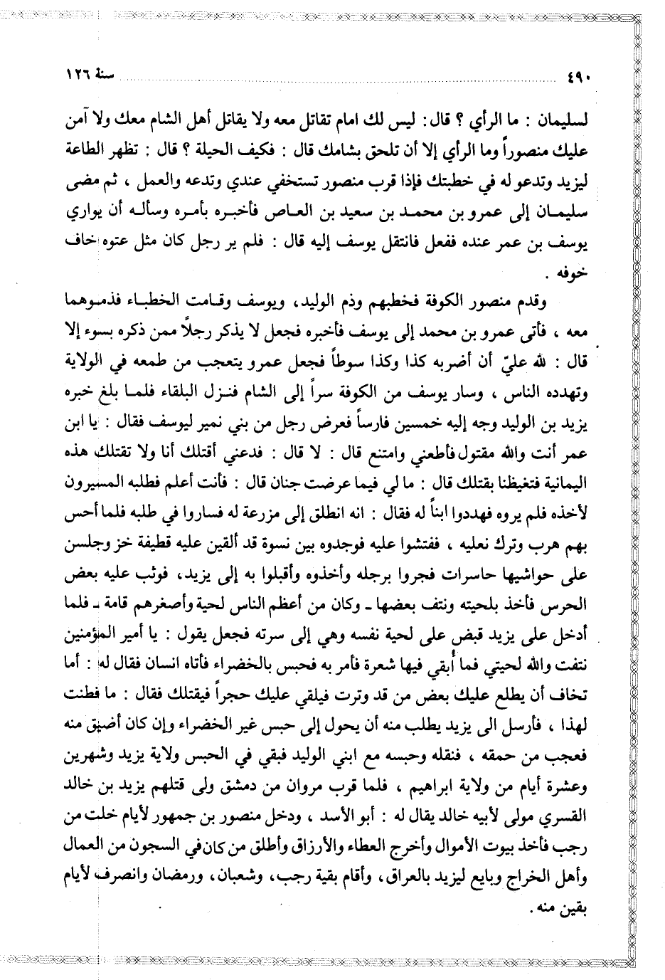 لسليمان ما الرأي قال ليس لك امام تقاتل معه ولا يقاتل أهل الشام معك ولا آمن عليك منصورا وما الرأي إلا أن تلحق بشامك قال فكيف الحيلة قال تظهر الطاعة ليزيد وتدعو له في خطبتك فإذا قرب منصور تستخفي عندي وتدعه والعمل ثم مضى سليمان إلى عمرو بن محمد بن سعيد بن العاص فأخبره بأمره وسأله أن يواري يوسف بن عمر عنده ففعل فانتقل يوسف إليه قال فلم ير رجل كان مثل عتوه خاف خوفه