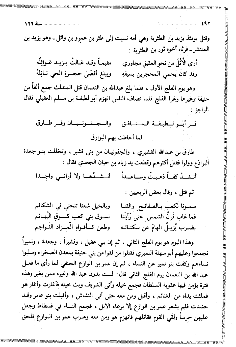 وقتل يومئذ يزيد بن الطثرية وهي أمه نسبت إلى طثر بن عمرو بن وائل وهو يزيد بن المنتشر فرثاه أخوه ثور بن الطثرية